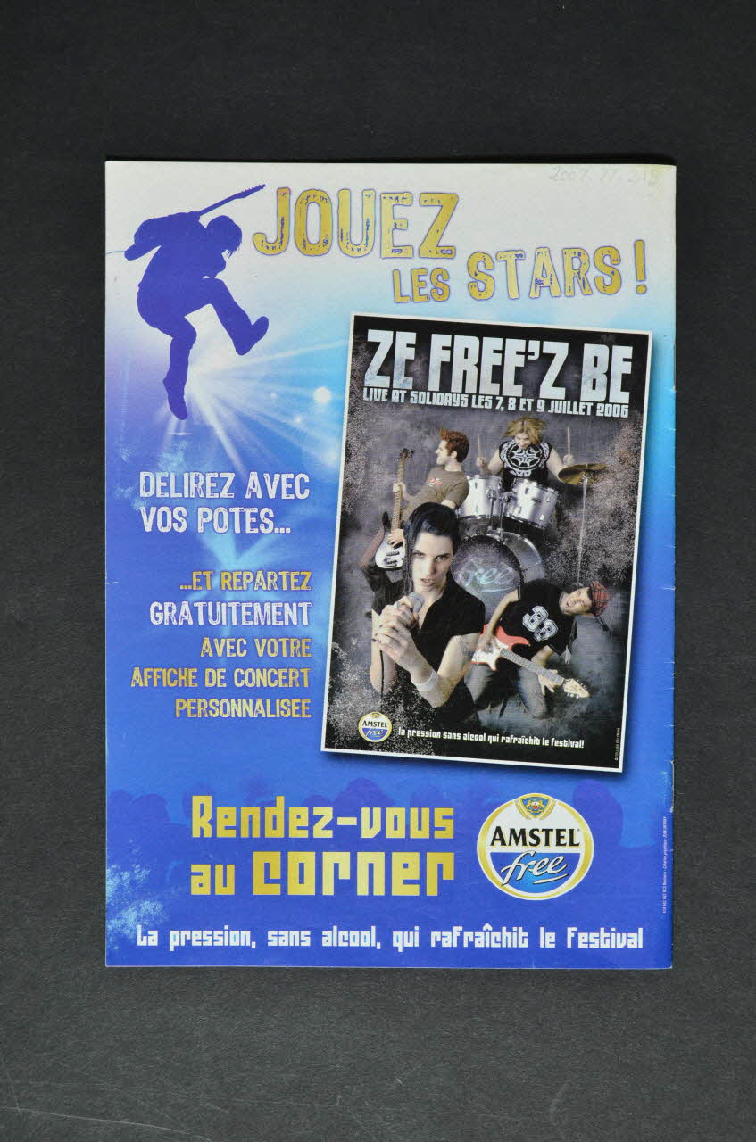 Double de 2007.66.039. - p.2 Publicité Carte 12-25 SNCF - p.3 Editorial : 7 ans de Solidays : "... c'est ensemble qu'on sera plus fort pour faire reculer les injustices de l'accès aux traitements du sida et les inégalités qui se creusent entre pays riches et pauvres. C'est "ensemble qu'on pourra lutter contre le cynisme de l'industrie pharmaceutique." - p.4-5 Les rendez-vous du week-end /"vendredi 7 juillet" / samedi 8 juillet"/ dimanche 9 juillet" / "Le rendez-vous de la nuit" - p.6 "Les RDV du week-end"."Le village solidarité" / "Le forum" / "Les parcours interactifs" / "Les moments forts" ("La cérémonie émouvante du Patchwork des noms", le témoignage sur scène des militants étrangers" , "l'hommage aux bénévoles sur la grande scène...") / "Les artistes de rue " /"Le village sporift" / "Le village du Monde" - p.7 Publicité du Festival La route du rock - p.8. "Campagne / On s'en fout pas", avec en dessous la petite mascotte porte voix. Débuts de phrase en violet, textes en noir "Qu'en 2006, seul 10% des malades à travers le monde bénéficient de traitements anti-rétroviraux alors que le sida fait chaque année 3 millions de morts et remet en question le développement des pays les plus vulnérables / Que les accords internationaux imposés par l'Organisation Mondiale du Commerce, limitent l'accès aux médicaments à bas prix dans les pays en développement / Que l'Union Européenne, dont la France est membre, bloque les pays africains dans leur volonté de simplifier ces accords / Que l'Organisation Mondiale du Commerce, dont la France est membre, laisse les Etats-Unis imposer des conditions encore plus strictes et nuisibles aux pays en développement / Que les pays du G8, dont la France est membre, ne financent pas la lutte contre le sida à la hauteur des besoins. / Qu'en France, les étrangers alades aient de plus en plus de difficultés à avoir accès aux soins. Un droit pourtant inscrit dans notre législation. / En 2006, Solidarité Sida renforce son engagement contre les inégalités et injustices de l'accès aux traitements dans les pays pauvres." - p.9 "Paris protège l'amour - p.10 "La nuit du zapping à Bercy : "Pour se dire adieu/ Cette nuit là sera la meilleure de toutes" - p.11 Publicité pour la nuit du zapping. - p. 12-13-14 "Les concerts"/ Date en blanc : "Vendredi 7 juillet" - p.15 Publicité Kill the Young en concert. - p.16 à 18, 20-22. "Les concerts"/ "Samedi 8 juillet / Dimanche 9 juillet" - p.19. Publicité Nice Jazz Festival p.23 Publicité T shirts Goeland - p.24-25 "C'est grâce à vous" / D'année en année, vous êtes de plus en plus nombreux à participer à l'aventure Solidays. Grâce à vous et à votre fidélité, Solidarité Sida peut poursuivre son action au profit des malades en France et à l'international. Voici quelques exemples des projets soutenus en 2004 et 2005." / "Soutiens à l'international" ("Kénédougou Solikdarité - Sikasso - Mali" / "Transforme - Brasilia - Brésil" / "Soutiens en France"( "ASFMF-Cayenne Guyane / Sol en Si Bobigny et Marseille" - p.26. "L'association": " Aider les malades et soutenir les associations" / "Prévenir et mobiliser les jeunes " / "Interpeller l'opinion publique et les décideurs politiques " / "Le bilan de 13 ans d'action. - p.27 Bulletin d'abonnement à Rock & Folk - p.28 Infos Pratiques - p.29 "Avec la Région Ile-de-France en route pour Solidays !.