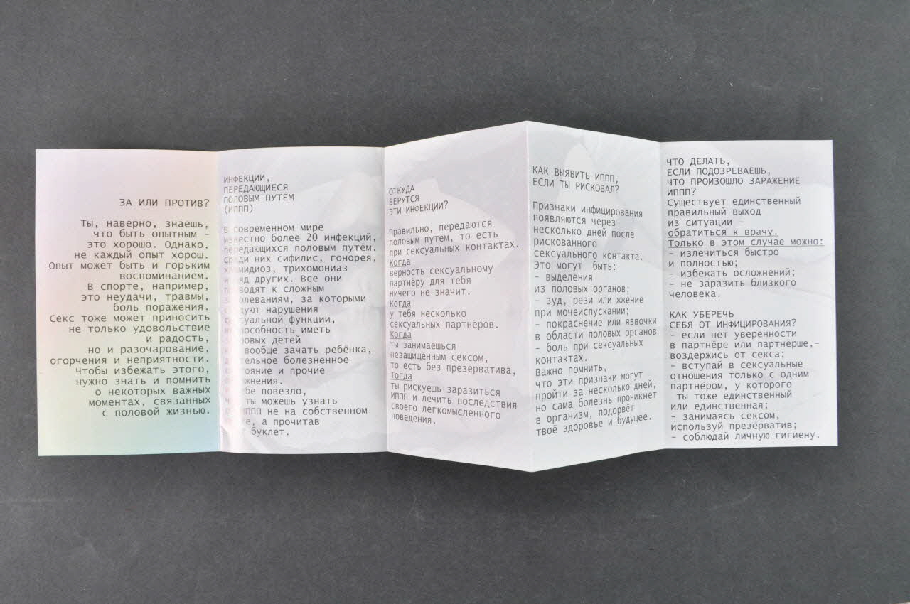 L'intérieur, à fond mauve très pâle, contient des inscriptions en capitales cyrilliques noires. Sur le 7ème feuillet, tenue dans une main, figure une coquille ouverte dans laquelle se trouve un foetus dans un uterus.