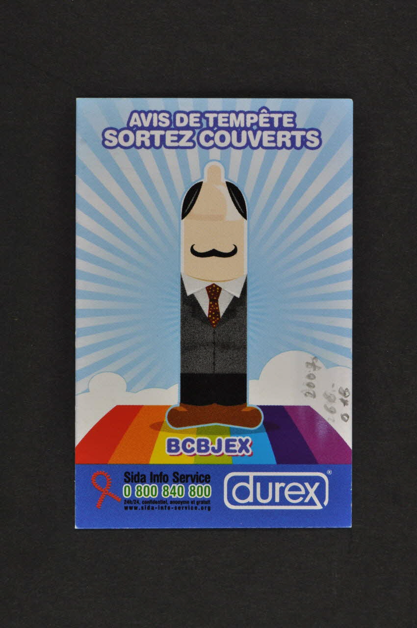 Au recto sur un fond bleu et blanc (nuages et orage), on peut voir au centre, sur un tapis de couleur arc en ciel, un préservatif anthropomorphisé en costume et cravate. En haut, en capitales blanches surlignées de violet il y a le titre et sous le rpéservatif il y a son nom. En bas dans un bandeau bleu on trouve le numéro d'une association et le nom d'une entreprise. Au verso, le fond est rayé bleu et blanc. Le texte est en caractères blancs sur toute la hauteur. En bas on retrouve les coordonnées de l'association et le logo de l'entreprise.Inscriptions
