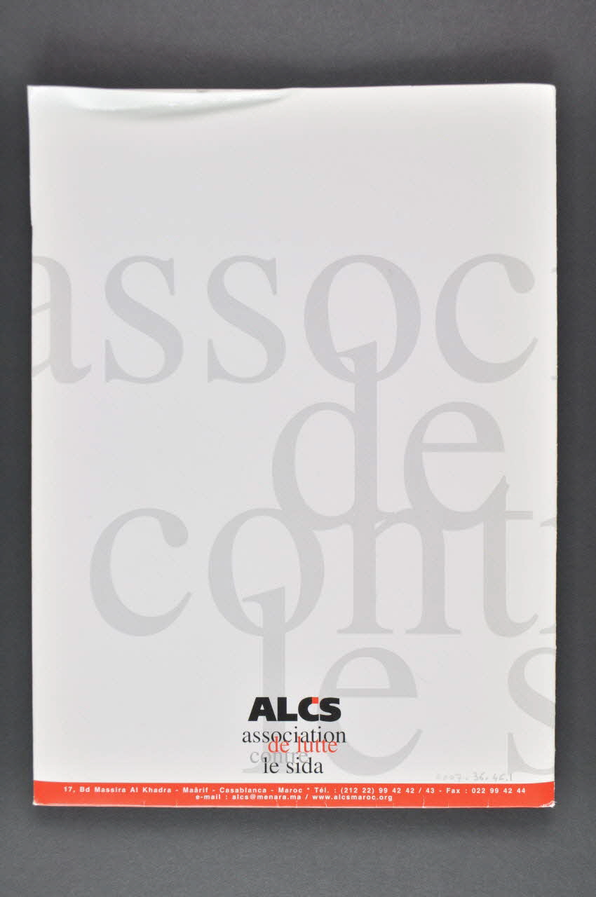 Le devant comprend le logo de l'association imprimé en noir, rouge et gris dans le haut. Dans la hauteur de la pochette est imprimée une partie du nom de l'association en grandes lettres grises ; ce nom se trouve complété au revers. Dans le haut à gauche est imprimé un encadré noir vertical contenant du texte en arabe blanc et rouge. Dans le bas, un bandeau noir contient du texte en blanc. A l'arrière, le logo de l'association est repris dans le bas au centre. Un bandeau rouge est placé dans le bas et mentionne les coordonnées complètes de l'association. Cette pochette contenait un grand nombre de documents. Une carte de visite est placée à l'intérieur (2007.36.46.2). Cette dernière est imprimée sur le recto uniquement. Le logo est présent ; les coordonnées de l'association sont placées dans le bas sur un bandeau rouge. Dans le coin supérieur droit, un encadré noir contient le nom du propriétaire de la carte de visite imprimé verticalement en blanc. Un dépliant en arabe (2007.36.46.3) est également présent dans la pochette.Inscriptions