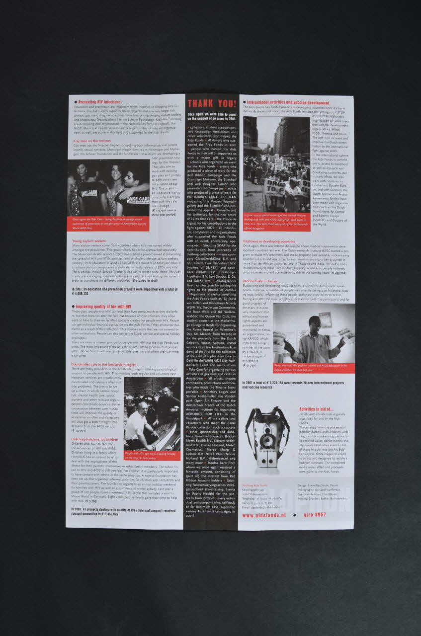 En haut, à gauche : présentation du dépliant. Au centre de la feuille, en caractères gras noirs, en anglais : "Ce résumé donne une idée des nombreux projets que AIDS Fonds peut soutenir." Sur la demi feuille du haut, avec des graphiques rouges : budget et comptes de l'association. Sur la demi feuille du bas, en noir sur deux colonnes. Présentation des projets de l'association : titres et sous titres en rouge, photos en noir et blanc, légendées en blanc sur bandeau rouge. - La recherche à un haut niveau aux Pays Bas : Les conséquences d'un usage à long terme des inhibiteurs du VIH / La recherche sur le vaccin - Information sur le VIH et le SIDA : Encouragement au dépistage / Utilisation du théâtre. Dos. Au centre, bandeau vertical noir, impression en blanc, titre en rouge : "Thank You". Liste des personnes physiques ou morales qui ont aidé l'association. De chaque côté, sur une colonne, suite de la présentation des projets de l'association : titres et sous titres en rouge, photos en noir et blanc, légendées en blanc sur bandeau rouge. - Prévention des infections par le VIH : Les hommes gays et internet / Les jeunes migrants - Améliorer la qualité de la vie avec le VIH : Coordination des soins dans la région d'Amsterdam / Vacances pour les enfants - Activités internationales et développement du vaccin : Traitement dans les pays en développement / Essais vaccinaux au Kenya - Autres activités : événements divers / expositions...