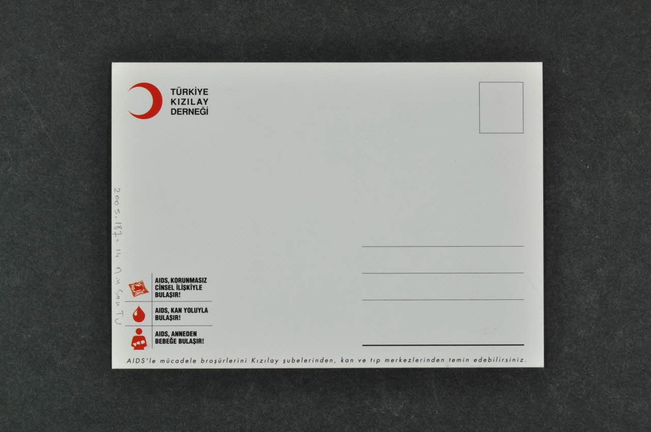 TÜRKIYE // KIZILAY // DERNEGI (en haut à gauche. // Au verso, en haut à gauche), rectoAIDS KORUNMASIZ // CINSEL ILISKIYLE // BULASIR! // // AIDS, KAN YOLUYLA // BULASIR ! (à gauche en bas), versoDécor