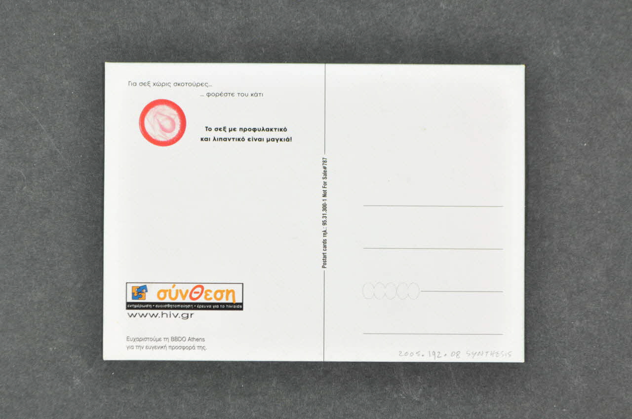 Au verso, le fond est uni et blanc. La moitié gauche est séparée de la droite par une ligne verticale droite et noire. Elle comporte des inscriptions en grec (non traduites) en partie supérieure, imprimées en noir, et accompagnées de la même photo qu'au recto: le préservatif rose.