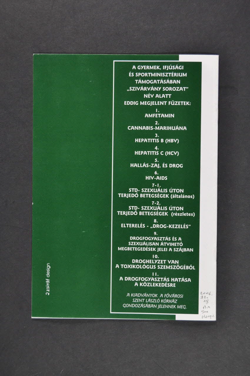 Au dos, les titres des autres numéros : 1. Amphétamine (2006.72.05) 2. Cannabis-Marijuana (2006.72.06) 3. Hepatitis B (HBV) (2006.72.07) 4. Hepatitis C (HCV) (2006.72.08) 5."Hallas -Zaj, ès drog" (Oreilles et drogues) (2006.72.09) 6. HIV/AIDS (2006.72.10) 7.1 IST (2006.72.11) 7.2 IST (2006.72.12) 8. Autres drogues ? (2006.72.13) 9. Drogfogyasztas ès a szexualisan atviheto megbetegedesek jelei a szajban (traduire) (2006.72.14) 10. Droghelyzet van. A toxikologus szemszögéböl (2006.72.15) 11. A drogfogyasztas hatasa a közlekedesre (2006.72.16)