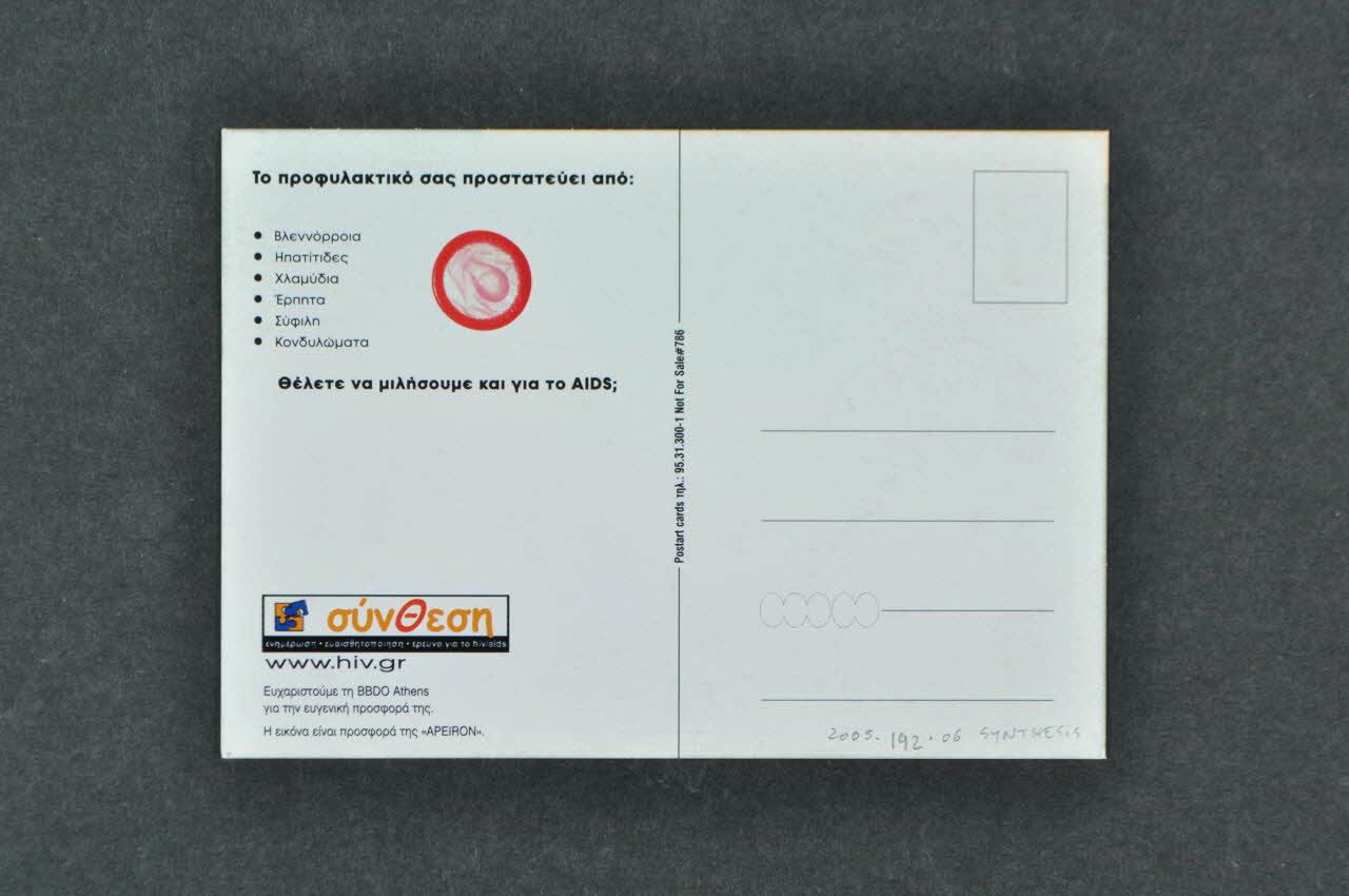 A gauche, une inscription est présente dans la partie haute. Cette inscription est accompagné de la photo d'un préservatif en rose. Un logo et une adresse se trouvent dans la partie basse.
