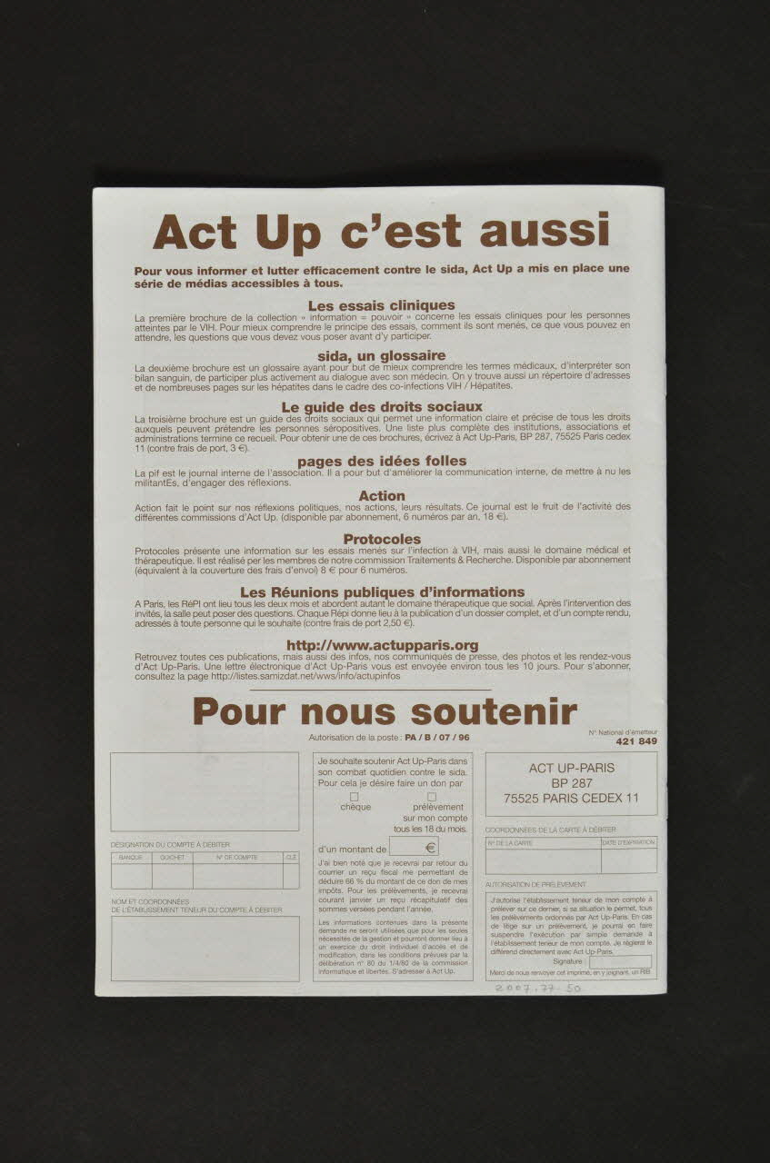 ACT UP-PARIS // BP 287 // 75525 PARIS CEDEX 11 (Imprimée sur le bulletin d'adhésion en brun), versoTitre