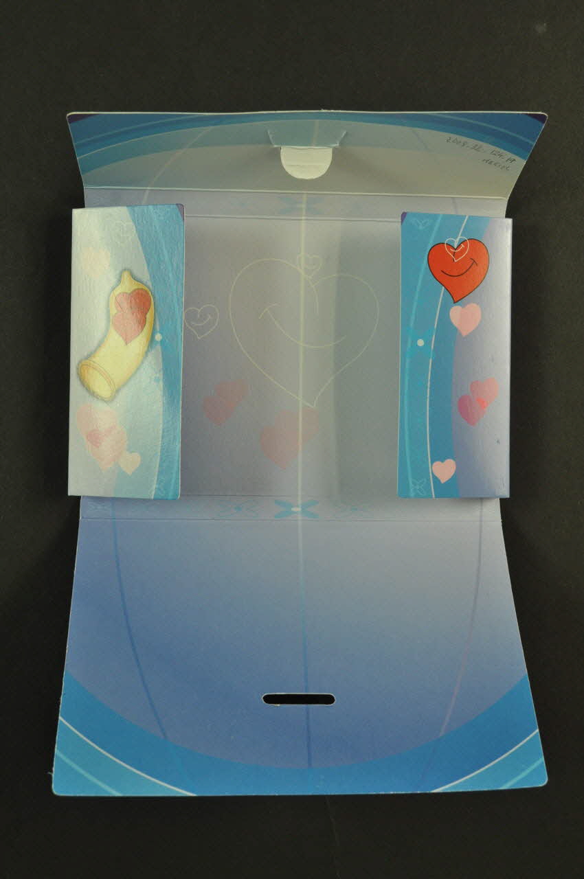 Elle présente une couleur mauve sur son ensemble, avec des arcs de cercle de différents bleus. Des inscriptions sont présentes sur le verso et sur le rabat inférieur. Des dessins de coeurs et de préservatifs décorent l'intérieur de l'emballage et les rabats de gauche et de droite.Inscriptions