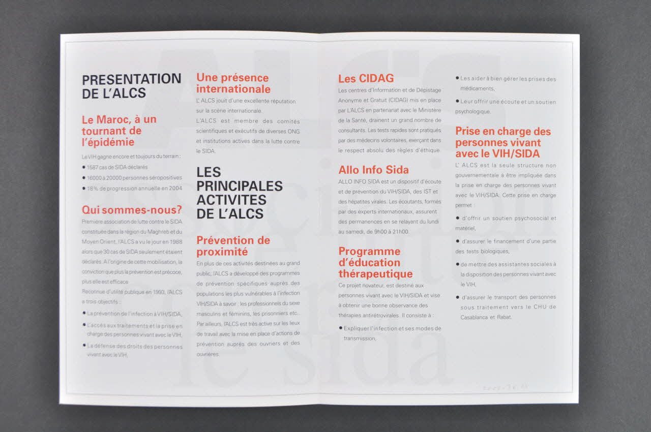 PRESENTATION DE L'ALCS // Le Maroc à un tournant de l'épidémie // Qui sommes-nous ? // Une présence internationale // // LES PRINCIPALES ACTIVITES DE L'ALCS // Prévention de proximité // Les CIDAG // Allo Info Sida // Programme d'éducation thérapeutique // Prise en charge des personnes vivant avec le VIH/Sida (Titres et sous-titres des parties imprimés en noir et rouge), à l'intérieurDécor