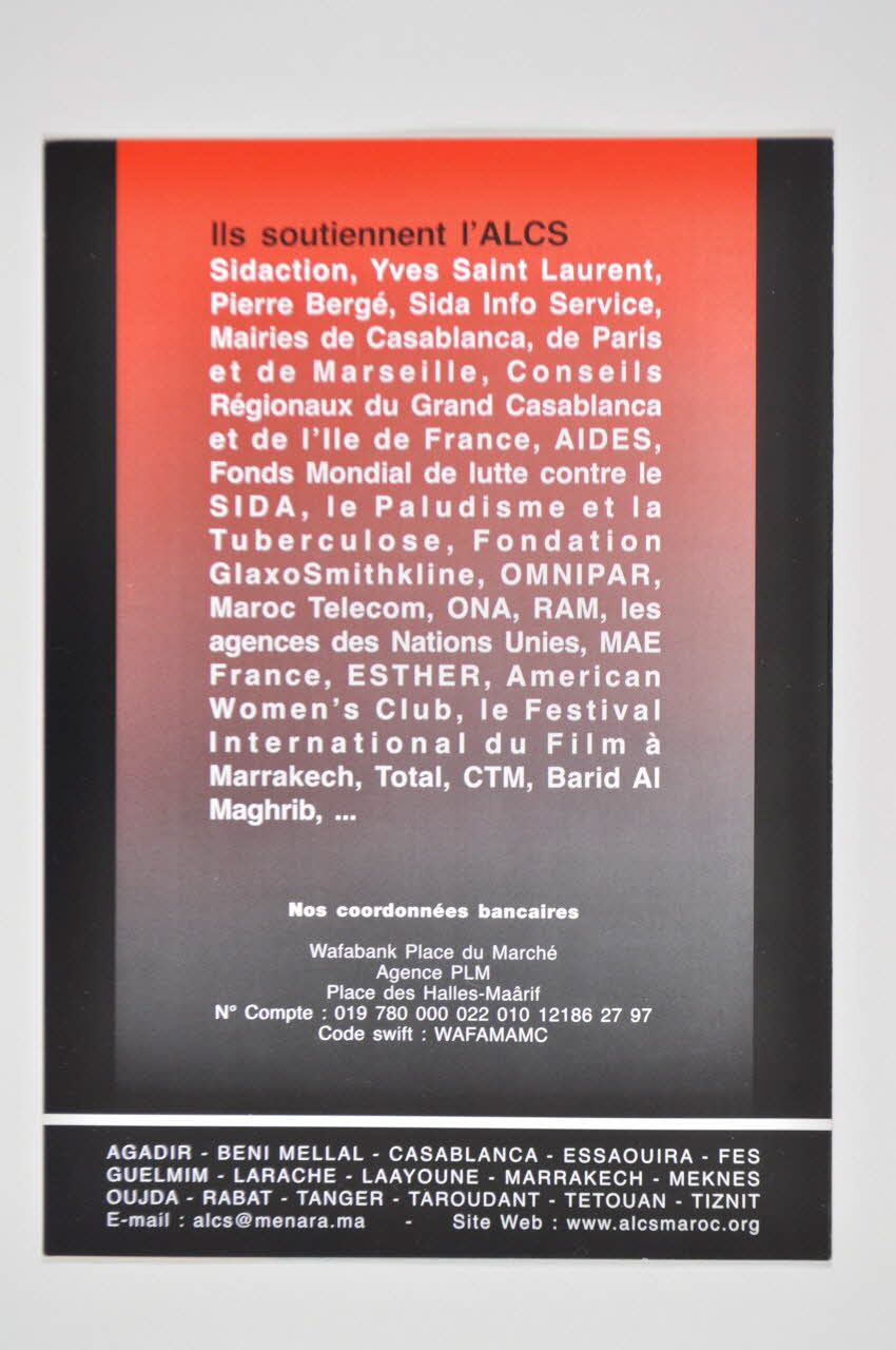 Ils soutiennent l'ALCS // Sidaction, Yves Saint Laurent, Pierre Bergé, Sida Info Service, Mairies de Casablanca, de Paris et de Marseille, Conseils régionaux du Grand Casablanca et de l'Ile de France, AIDES, Fonds mondial de lutte contre le sida, le paludisme et la tuberculose, Fondation GlaxoSmithkline, OMNIPAR, Maroc Telecom, ONA, RAM, les agences des Nations Unies, MAE France, ESTHER, American Women's club, le Festival International du Film à Marrakech, Total, CTM, Barid Al Maghrib,... (Imprimé en noir et blanc), versoPour poursuivre et développer nos activités, pour que les personnes vivant avec le VIH bénéficient des traitements, pour que le Maroc reste un pays de faible prévalence, nous avons besoin de votre soutien financier. (Imprimé en blanc sur noir dans le bas, au centre), rectoAssociation reconnue d'utilité publique (Imprimé en blanc sous le logo), rectoSommaire