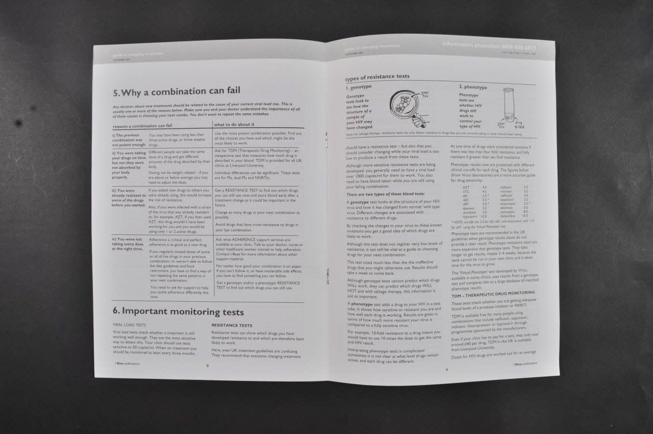 Summary 3 // 1. A note on resistance and adherence 4 // 2. Further information 4 // 3. Introduction 5 // 4. What to do about a rising viral load 6 // 5. Why a combination can fail 8 // 6. Important monitoring tests 8 // 7. Choices for your next combination 11 // 8. Treatment strategies 12 // [...] // 9. Changing treatment to avoid side effects 15 // 10. Expanded access and experimental drugs 16 (Imprimé en noir sur blanc dans le haut à gauche de la page 2), à l'intérieurDécor