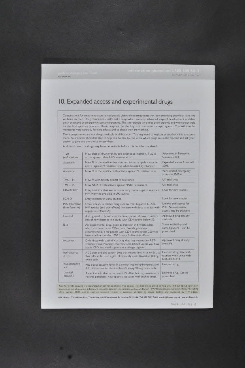 Cette brochure est un exemplaire de la revue "Changing treatment" de HIV i-Base. Elle est composée de seize pages imprimées sur du papier mat et reliées entre elles par des agrafes métalliques.