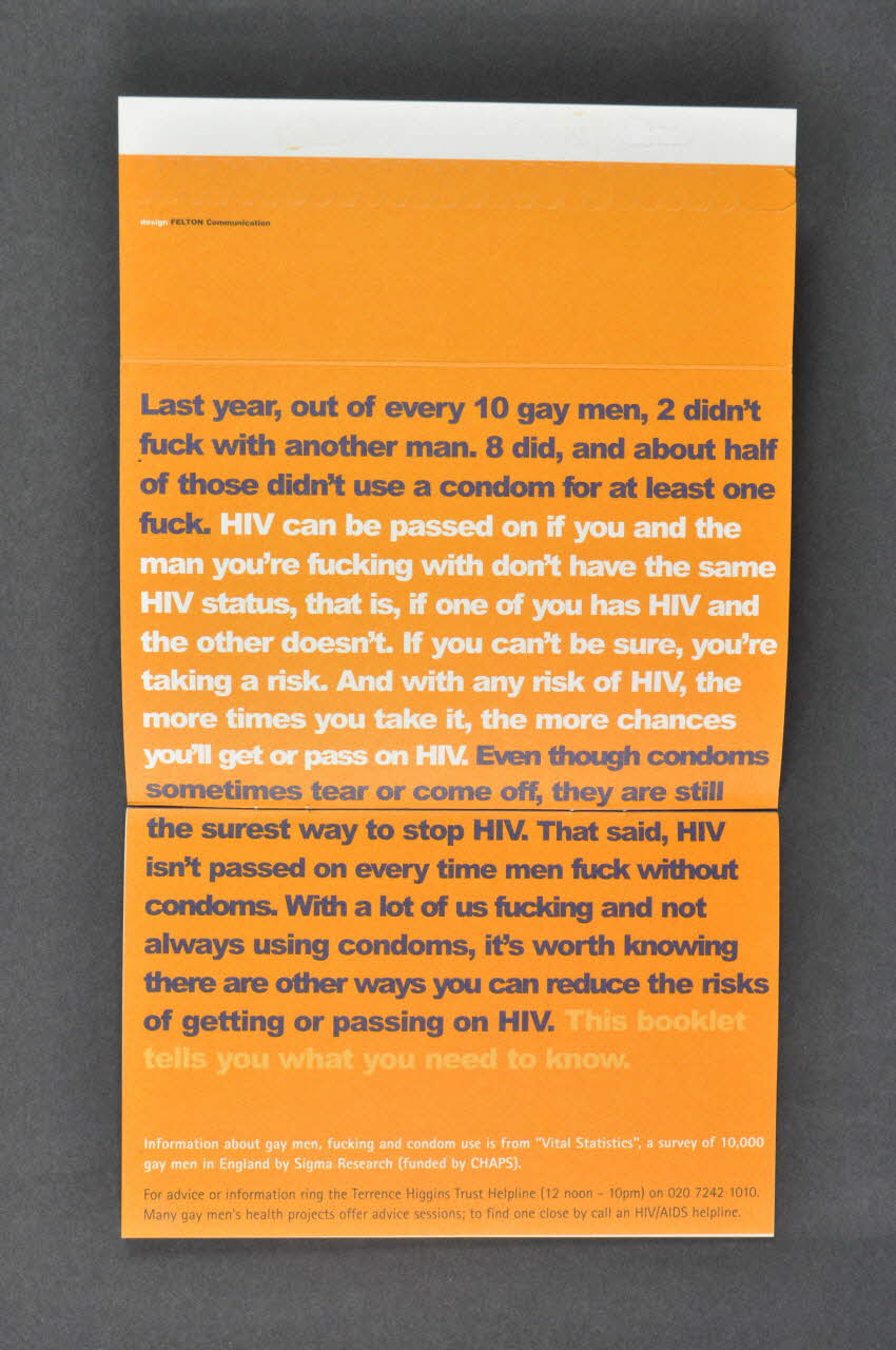 It's safer to fuck than get fucked // // Fucking or getting fucked : the more men, the more risks // // The longer and harder the fuck, the bigger the risk // // Pulling out before cumming is safer // // Sexually transmitted infections make HIV more of a risk // // A higher viral load makes it easier to pass HIV on // // If you don't have HIV you can't pass it on // // Condoms are not 100% safe // // These facts can't stop you getting or passing on HIV, but what you do with them might (Liste des titres), à l'intérieurAll the // f***ing // facts, sur la couvertureAdresse