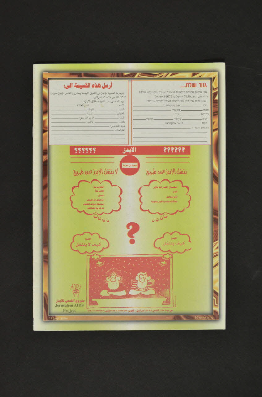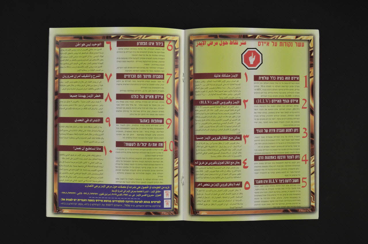Commentaire du donateur : Le Jerusalem AIDS project travaille aussi sur le Moyen Orient. L'association a organisé un réseau... incluant palestiniens, jordaniens, égyptiens, marocains, turcs, israéliens travaillant ensemble. En hébreu et en arabe, description des activités, et messages clé sur le sida (les mêmes que sur l'affiche 2007.75.1).