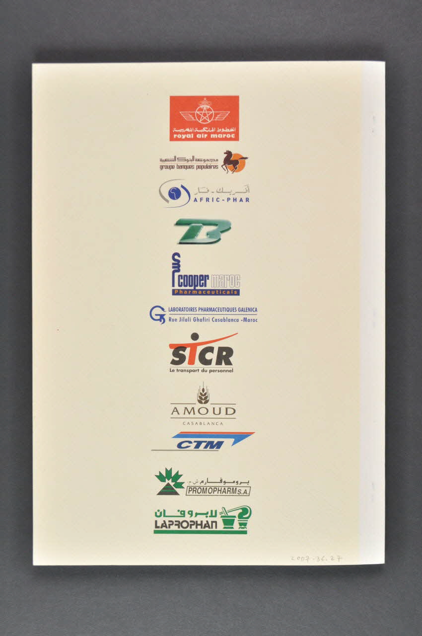 La couverture crème comporte de haut en bas: un événement en caractères noirs, le lieu et la date en orange, puis le titre de l'événement au centre en orange souligné de noir, suivi d'initiales en français et en arabes, puis d'un bandeau noir contenant l'adresse orange de l'association. Le dos comprend plusieurs logos sur toute sa hauteur: Royal air Maroc, groupe banques populaires, Afric-phar, "B", Cooper Maroc Pharmaceiticals, Laboratoires Galenica, SICR, Amoud, CTM, Propharm, Laprophan. A l'intérieur, seuls les rectos des trois premières pages sont imprimés d'écritures vertes et oranges contenant le programme de l'événement et les remerciements. Les autres pages sont blanches, laissées libre pour prendre des notes.Inscriptions