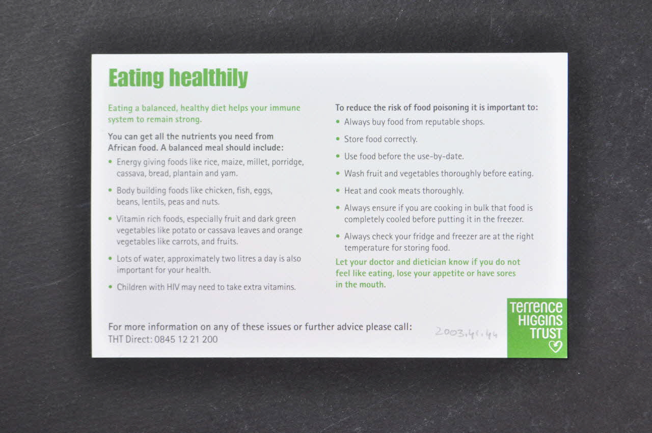 Eating healthily / Eating a balanced, healthy diet helps your immune / system to remain strong. / [...] / Let your doctor and dietician know if you do not / feel like eating, lose your appetite or have sores / in the mouth. (Texte imprimé en noir sur le fond blanc du dos de la carte avec le titre et le premier et le dernier paragraphe en vert.), versoDécor