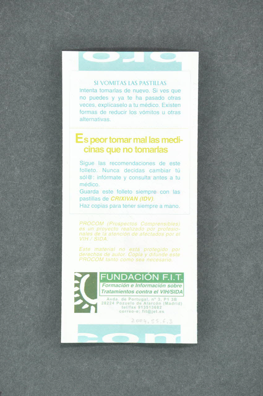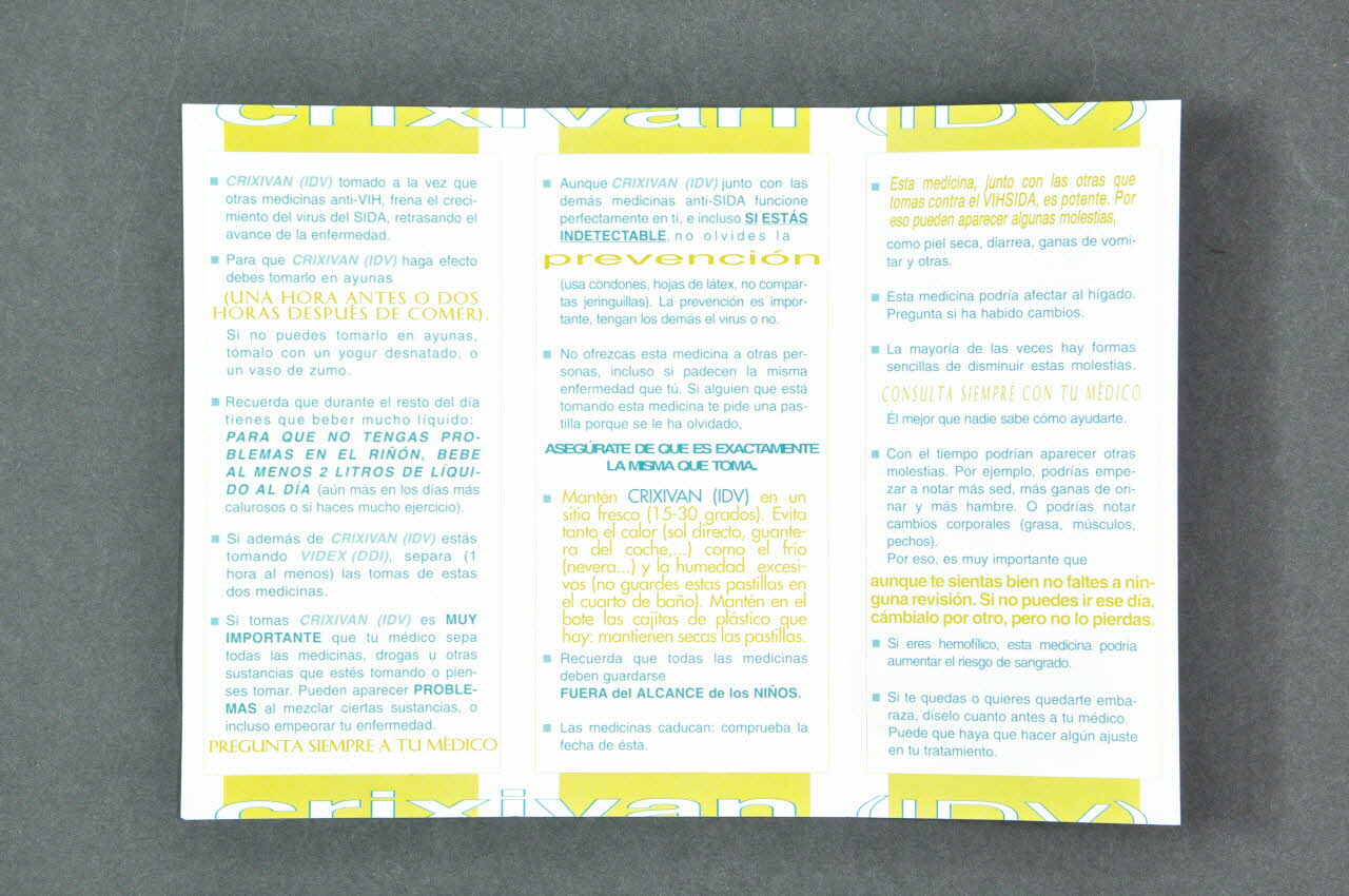 PREGUNTA SIEMPRE A TU MEDICO // // no olvides la // prevención // // Mantén CRIXIVAN (IDV) // en un sitio fresco (15-30 // grados). Evita tanto el calor // (sol directo, guantera del // coche,...) como el frio exce- // sivos (nevera,...) // // FUERA del ALCANCE de los NIÑOS. // // Esta medicina, junto con las otras // que tomas contra el VIH/SIDA, // es potente. Por eso pueden apa- // recer algunas molestias, // // CONSULTA SIEMPRE CON TU MEDICO // // aunque te sientas bien no faltes a nin- // guna revisión. Si no puedes ir ese dia, // cambialo por otro, pero no lo pierdas. // // SI TE OLVIDA LA TOMA // // SI INTERRUMPES EL TRATAMIENTO // ANTI-SIDA // // SI VOMITAS LAS PASTILLAS // // Es peor tomar mal las medi- // cinas que no tomarlas (Au recto et au verso)Décor