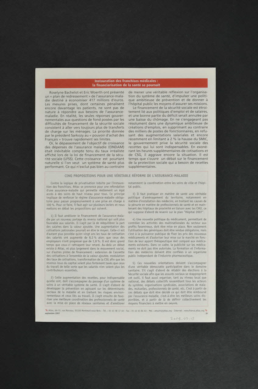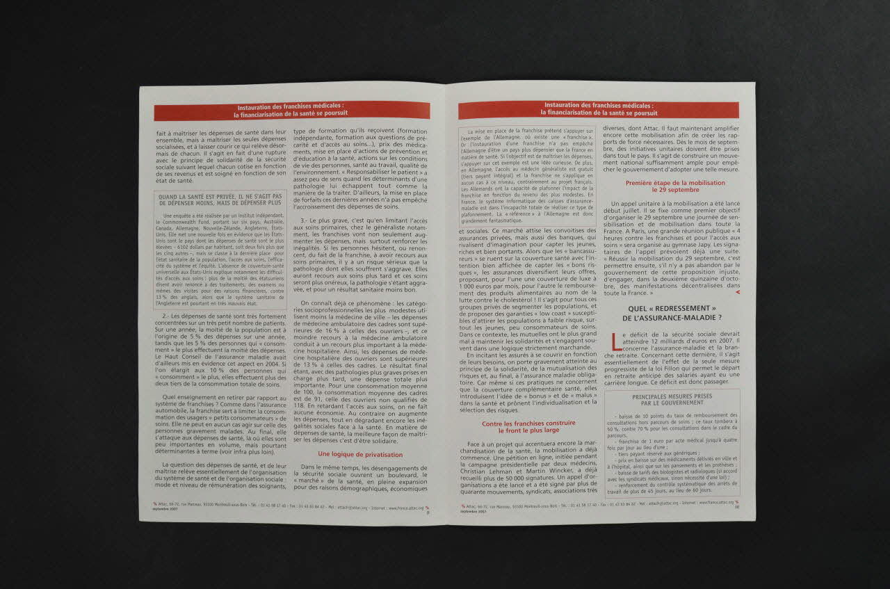 Instauration des franchises médicales : // la financiarisation de la santé se poursuit (En blanc sur un encadré rouge, en partie supérieure de chaque volet)Trois raisons de s'opposer aux franchises // // Une logique de la privatisation // // Contre les franchises, construire le front le plus large // // Première étape de la mobilisation : le 29 septembre (titres des différents paragraphes, en rouge)Nom d'association