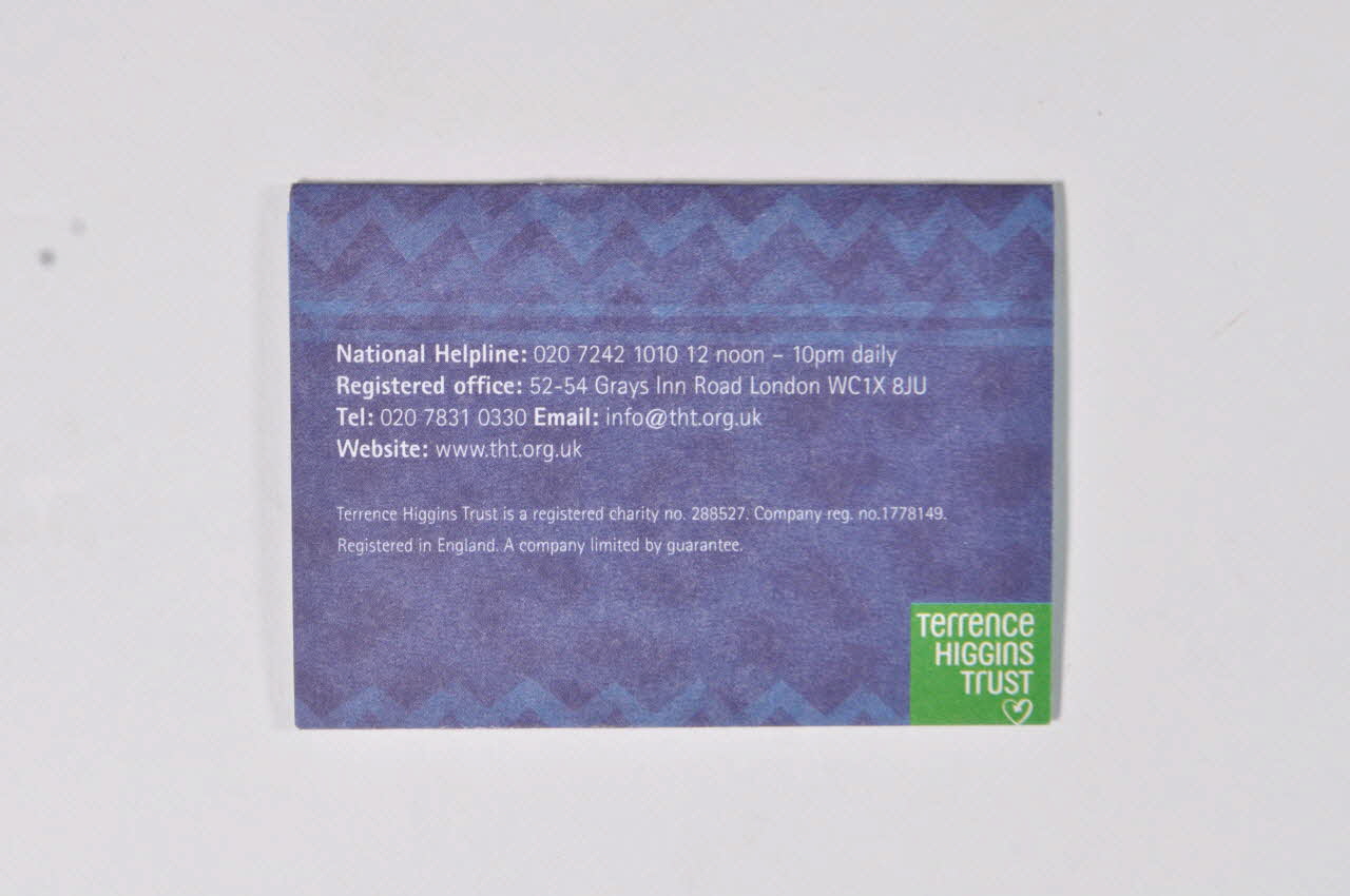 National Helpline : 020 7242 1010 12 noon-10pm daily // Registered office : 52-54 Grays Inn Road London WC1X8JU // Tel : 020 7831 0330 Email : info@tht.org.uk // Website : www.tht.org.uk // // Terence Higgins Trust is a registered charity no.288527. Company reg. no.1778149. // registered in England. A company limited by guarantee. // // Terrence // Higgins // Trust (au dos)Décor