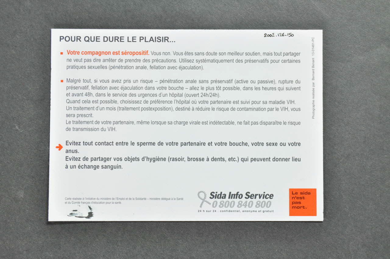 De : Lieu : FranceDate : 2002Carte réalisée à l'initiative du Ministère de l'Emploi et de la Solidarité. délégation à la santé. et du Comité Français d'Education pour la Santé" Campagne : "Le sida n'est pas mort.