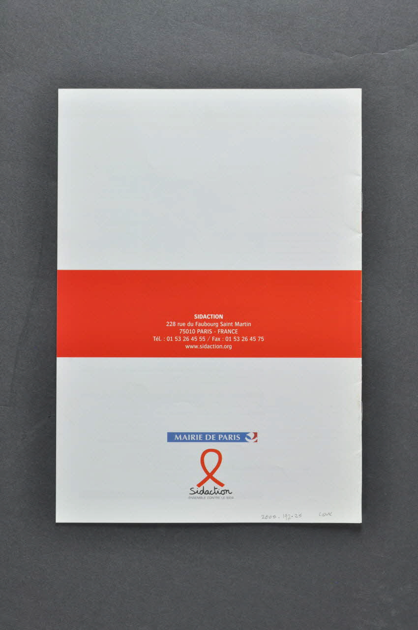 Le dos. Fond blanc présente les coordonnées de Sidaction, son logo et celui de la Mairie de Paris.