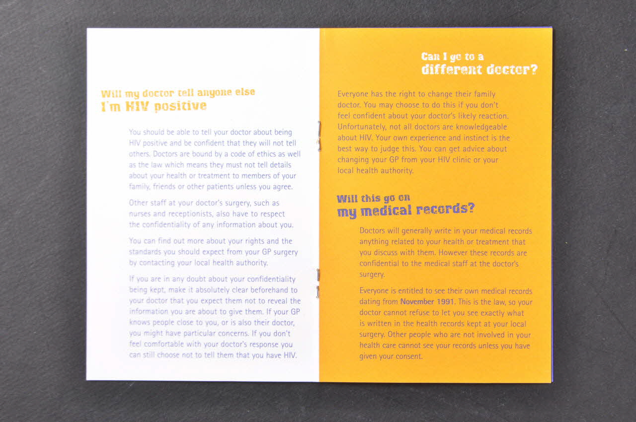 CONFIDENT? // CONFIDE?, sur la couvertureDoes my GP need to know? // Why might telling my doctor be a good idea? // Will my doctor tell anyone else I'm HIV positive // Can I go to a different doctor? // Will this go on my medical records? // Will this affect any medical reports I need in the future? // Who can help me decide? (Liste des titres du texte à l'intérieur), à l'intérieurWhere can I get more information or advice? // // Terrence Higgins Trust Regional Centres // // The HIV & AIDS charity for life (Seuls les titres en blanc sont transcrits), versoLogo