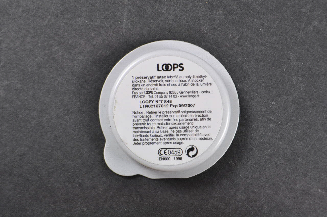 LOOPS // // 1 préservatif latex lubrifié au polydiméthylsiloxane. Réservoir, surface lisse. A stocker dans un endroit frais et sec à l'abri de la lumière directe du soleil. // Fab par LOOPS Company 92635 Gennevilliers - cedex - FRANCE [...] // // EXP 09/2007 // // Notice : Retirer le préservatif soigneusement de l'emballage, l'installer sur le pénis en érection avant tout contact entre les partenaires, afin de prévenir toute maladie sexuellement transmissible. Retirer après usage unique en le maintenant à sa base, ne pas utiliser de lubrifiant huileux, vérifier la compatibilité avec des traitements éventuels auprès d'un médecin. Jeter proprement après usage., versoDécor