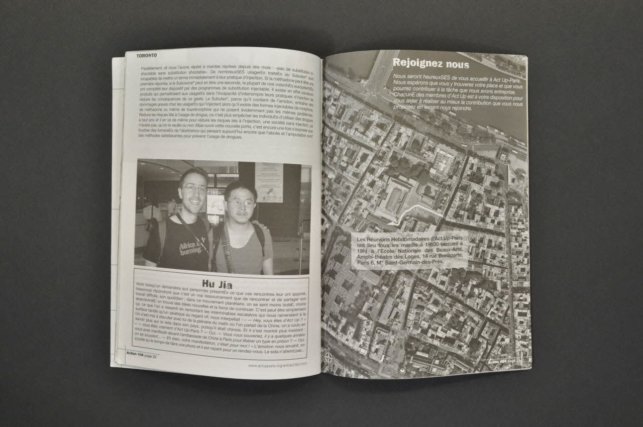 - p.2-3 Editorial : "Sida : où sont les candidats ?" (à propos de l'élection présidentielle) // - p.4-5 : Act Up en action. Série de petites photos noir et blanc d'actions de l'association, présentées en arc de cercle : 1er mai : Euromayday / juin : marche des fiertés / 14 juillet : manifestation / 12-18 août : Conférence internationale sur le sida à Toronto / Septembre : Rassemblement pour défendre les sans papiers de Cachan / Septembre : manifestation place Notre Dame / Octobre : Existrans. // - p.8-10 Dossier Toronto : "Du rififi dans la prévention" (nouvelles approches et préservatif) // - p.11-12 Dossier Toronto : "L'internationale HSH" (pré conférence sur les hommes ayant des rapports sexuels avec des hommes) // - p.13-14 Dossier Toronto : "Coup de gueule" (une seule et unique session sur la coinfection VIH-hépatites) // - p.15 Dossier Toronto : "Le laboratoire invisible" (Abbott et l'absence de réponse sur la nouvelle formulation du Norvir) // - p.16-17 Dossier Toronto : "DART compte les morts !" (à propos de la protestation des activistes Ougandais sur les problèmes éthiques de l'essai DART) // - p. 18-19 Dossier Toronto : "Unitaid : une initiative très visible mais peu lisible" // - p.20-22 Dossier Toronto : "Le classement du Subutex (dans les produits stupéfiants) abandonné (en France). Et après ?" // Encarté après la page 22. En noir sur fond jaune clair, sur 2 colonnes. "Action = Vie. Bulletin d'information sociale pour les personnes atteintes par le VIH" : "L'aide médicale d'Etat" // - p.23 : Rejoignez-nous // - p.24-26 Envie d'en être ? (entretien avec Gérald, un des militants d'Act Up, séropositif. // - p.27-29 (en blanc sur fond noir, sur deux colonnes) Sida is disco : La permanence des droits sociaux : présentation // - p.30 Commission jeunes // - p.31 Place des morts du sida : Lettre ouverte à Delanoë sur sa décision de nommer le parvis de Notre-Dame "Place jean-Paul II" // - p.32 Trans : L'invisibilité tue // - p.33 Toulouse : Non à la délocalisation de La Grave (hôpital) // - p.34-35 International : Les présidentiables socialistes tiendront-ils les engagements du G8 pour accélérer l'hécatombe du sida ? // - p.36 EtrangerEs : Lettre ouverte à Jacques Chirac relative à la protection des étrangers malades // - p.37 EtrangerEs : 18 572 malades en danger de mort (projet de circulaire du ministère de l'intérieur pour l'expulsion de malades étrangers) // - p.38-41 Prisons : CachéEs et ignoréEs, prisonnierEs (transmission du VIH et des hépatites dans les prisons françaises) (au fil des pages)Décor