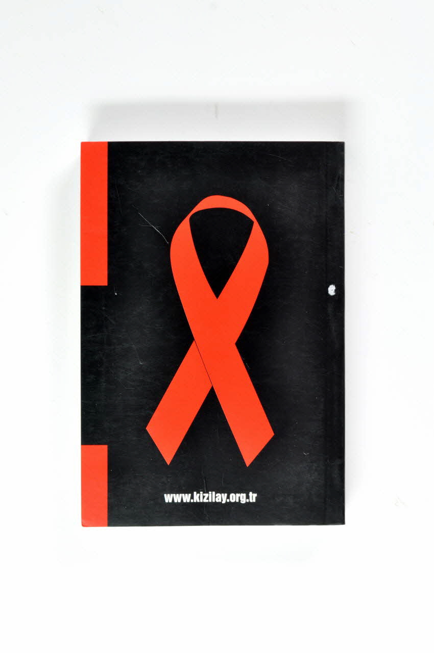 Agenda en carton et papier imprimé et collé, de forme rectangulaire. La couverture est noire.Le ruban rouge plié est imprimé au centre avec l'année "2005" en dessous. En haut, à gauche, le logo de la "Red Crescent society"est imprimé en blanc, noir et rouge.A gauche et à droite, deux inscriptions sont imprimées à la verticale. (campagne d'information avec la brochure 2005.170.07 et les cartes postales 2005.170.10, 11, 12, 13.) Le dos est à fond noir.Deux bandes rouges sont imprimées sur le côté gauche. Au centre, on trouve un grand ruban rouge et en bas, l'adresse internet est imprimée en blanc. A l'intérieur, les pages sont blanches avec des impressions en noir et le grand ruban rouge en sous impression. Sur les premières pages, sont imprimés les calendriers 2005 et 2006, des codes téléphoniques et des numéros de la ligne téléphonique sur le sida. En tête de chaque mois, un des conseils de la campagne est imprimé sur fond blanc avec à gauche bande verticale noire avec en haut le logo du Croissant Rouge, en bas,toujours un ruban rouge et au centre : "Okumaya Basla !".Inscriptions