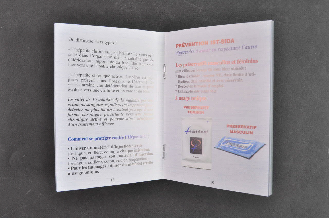 Sommaire // - p.1 (fond vert) Présentation de l'Association Franco Maghrébine (AFM). Coordonnées à Villeurbanne. // - p.2 Préface du Professeur Touraine, Lyon. appel à la solidarité. // - p.4 Le Sida : Qu'est-ce que le sida ? / Quels sont les modes de transmission ? / Quand faut-il consulter ? / Comment se fait le dépistage / Que veut dire être séropositif ? / Existe-t-il un traitement ? / Le virus du Sida ne se transmet pas dans l'ensemble des gestes de la vie quotidienne / Ceci ne transmet pas le virus du sida (avec petits dessins : WC, piscine, hammam, gymnase, dentiste, docteur, lieux publics, don du sang, école, café, restaurant, seringue à usage unique, rapport protégé, piqûres d'insectes, animaux domestiques, la salive, amitié et travail) / Attention ! Ceci transmet le virus du sida. Pratiques à haut risque (avec petits dessins : Pénétration vaginale non protégée, pénétration anale non protégée homme homme et homme femme, gode non protégé, partage de seringues). Pratiques à risque faible (avec petits dessins : fellation, cunnilingus) // - p.12 Sans indication de provenance : affiche : "L'amour est enfant de bohème. Prends garde à toi; // - p.13-19 Les IST : Ce que c'est / Elles sont dues à.../ Les signes qui doivent alerter / Mesures à prendre / Il est important de consulter / Comment se protéger / Exemples d'IST : les hépatites / Prévention IST-Sida : Apprendre à aimer en respectant l'autre. Les préservatifs masculins et féminins // - p.20-21 En résumé : Vous êtes atteint par le VIH / Vous n'êtes pas atteint par le VIH / Les traitements // - p.22-24 En cas de prise de risque : // p.24 En gros caractères rouges, bleus, rouges, verts : "Dépistage VIH Sida. Que faire aujourd'hui ? / Vous avez pris un risque n'attendez plus 3 mois. / Réagissez vite. consultez... / mais avant tout n'oubliez pas de vous protégez et de protéger les autres." / Le traitement d'urgence dans les heures qui suivent le risque / De 15 à 30 jours après le risque / 3 mois après le risque. // - p.25 à 32 Adresses utiles de la région : CIDAG / Les associations spécifiques VIH/SIda/ Sida info Service / Centres de soins agréés aux toxicomanes / Centres de soin et substitution / Autres téléphones utiles / Reproduction des affiches : Drogue Info service et Sida Info Service et des couvertures des CD et cassettes : Prévention sida arabe maghrébin / hépatites virales arabe maghrébin / Prévention sida en berbère // - p.33 à 36 explications en arabeDécor