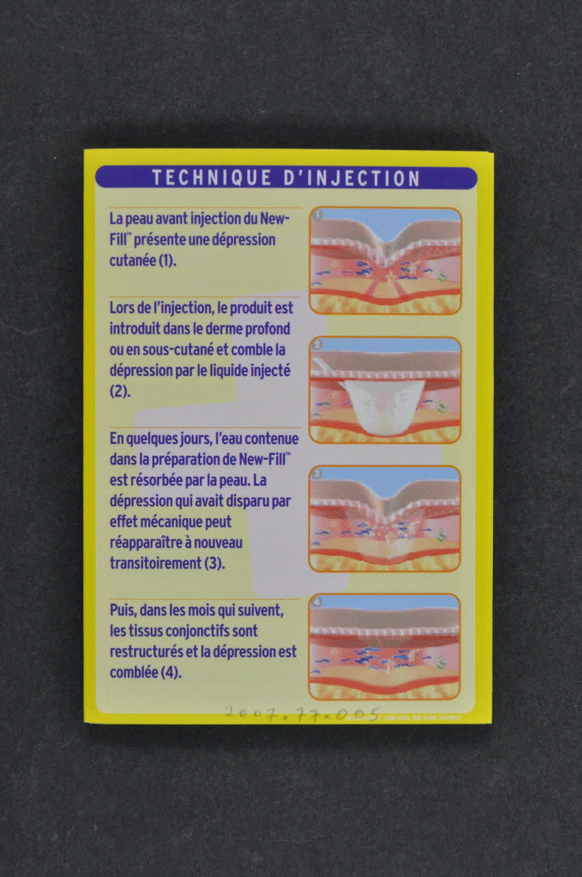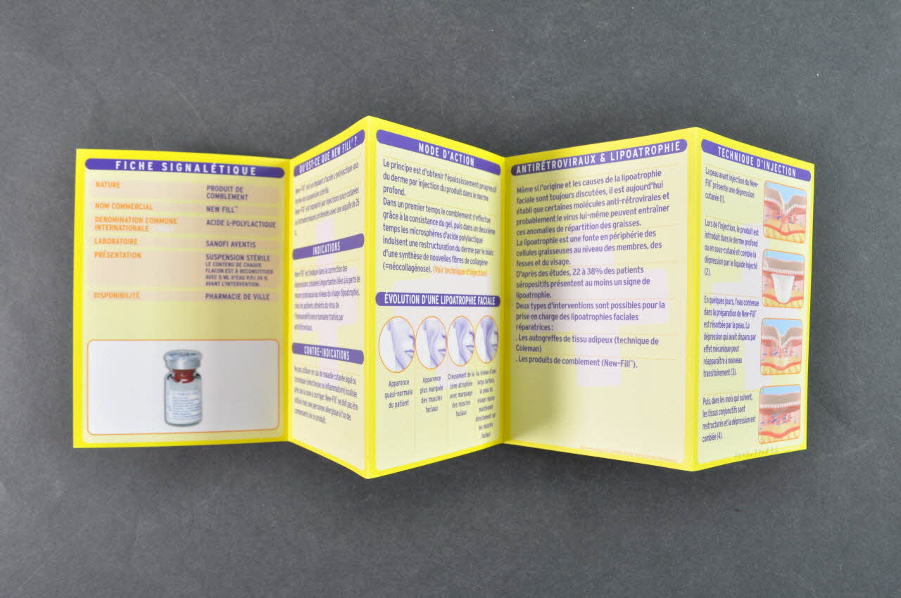 Sommaire : // - Fiche signalétique (sur tableau dont les lignes sont roses et les titres orange et dessin du flacon // - Qu'est-ce que New Fill ? // - Indications // - Contre-indications // - Mode d'action // - Evolution d'une lipoatrophie faciale // - Antirétroviraux et lipoatrophie // - Technique d'injection // - Précautions d'emploi // - Effets indésirables // - Délivrance et remboursement : (en orange) "Depuis janvier 2005, le Nex-Fill, grâce à la pression des // associations de lutte contre le sida, notamment du TRT-5 est délivré et pris en charge de la manière suivante (...) // - Attentes et résultatsMarque