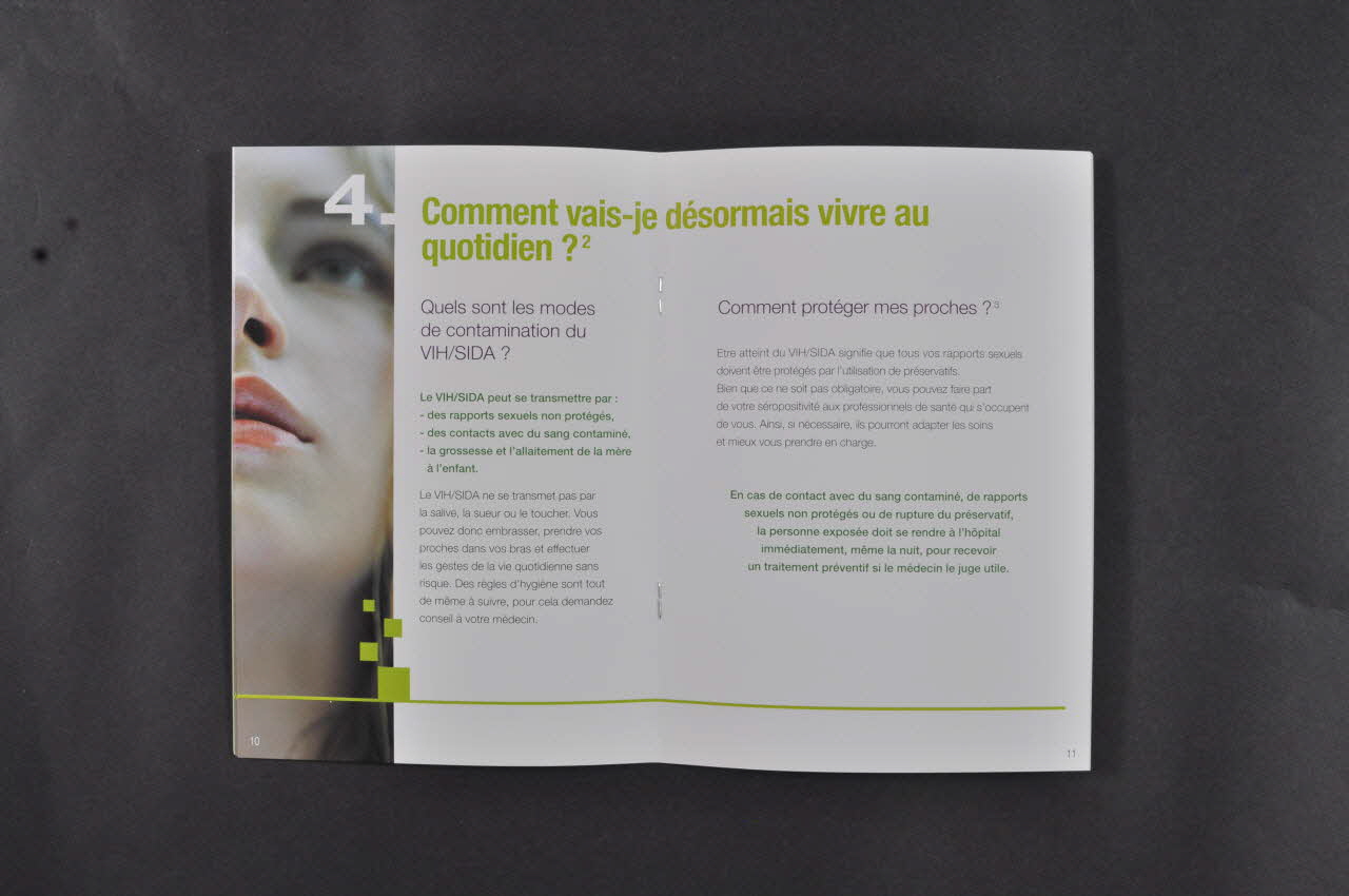 1. Qu'est-ce que le VIH/Sida ? (p. 4 à 5) // 2. Pourquoi suivre scrupuleusement mon traitement ? (p. 6 à 7) // 3. Comment vais-je être suivi ? (p. 8 à 9) // 4. Comment vais-je désormais vivre au quotidien ? (p. 10 à 17) (Imprimé en vert et violet dans le bas de la page 3), à l'intérieurDate