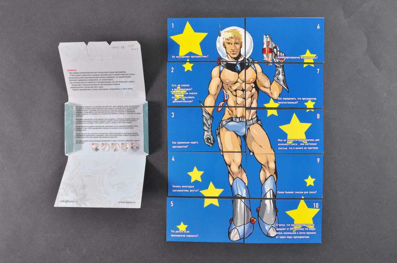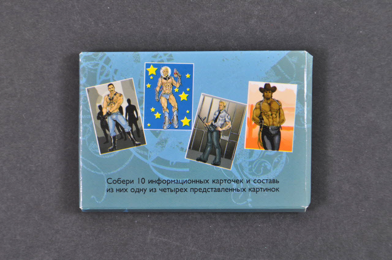 A l'intérieur de l'enveloppe est rangé le jeu, constitué de dix cartes. Le recto de celles-ci forme un puzzle représentant un homme, musclé, vêtu d'un slip et de bottes de cosmonautes, sur un fond étoilé.