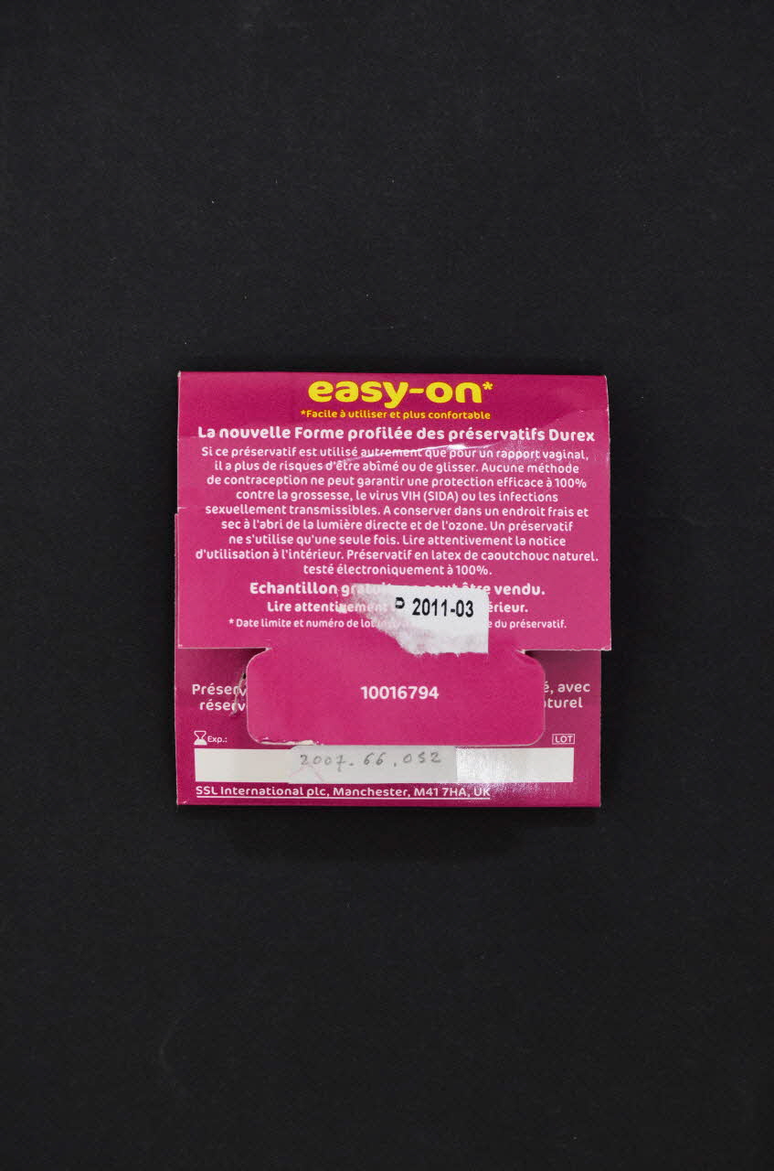 Le recto est sur fond fuschia et porte des inscriptions sur les quatre languettes et la face principale où figure en haut à gauche le logo de la maque en blanc sur fond bleu. L'intérieur est sur fond blanc et porte des inscriptions en noir ainsi que six vignettes illustrées. A l'intérieur de l'étui figure un préservatif emballé (2007.66.52.2) dans du plastique. Il est de forme carrée et porte sur une face, rose, le logo de la marque en blanc sur fond bleu, que l'on retrouve sur l'autre face unie en gris. Au centre figurent des inscriptions en vert.Inscriptions