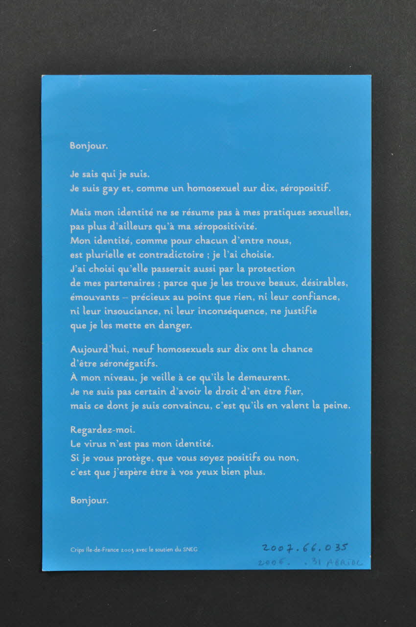 Bonjour / Je sais qui je suis. / Je suis gay et, comme un homosexuel sur dix, séropositif. / Mais mon identité ne se résume pas à mes pratiques sexuelles, / pas plus d'ailleurs que ma séropositivité. / Mon identité, comme pour chacun de nous, / est plurielle et contradictoire ; je l'ai choisie. / J'ai choisi qu'elle passerait aussi par la protection / de mes partenaires ; parce que je les trouve beaux, désirables, / émouvants - précieux au point que rien, ni leur confiance, / ni leur insouciance, ni leur inconséquence, ne justifie / que je les mette en danger. / Aujourd'hui, neuf homosexuels sur dix ont la chance / d'être séronégatifs. / A mon niveau, je veille à ce qu'ils le demeurent. / Je ne suis pas certain d'avoir le droit d'être fier, / mais ce dont je suis convaincu, c'est qu'ils en valent la peine. / Regardez-moi. / Le virus n'est pas mon identité. / Si je vous protège, que vous soyez positifs ou non, c'est que j'espère être à vos yeux bien plus. / Bonjour. // // Crips Ile-de-France 2005 avec le soutien du SNEG (En blanc sur fond bleu turquoise.), verso