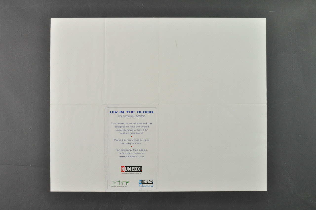 3 // SUMMARY // HIV drugs either work outside or inside your T-celles [...] The goal is to lower HIV in your blood to undetectable levels and increase your number of T-cells. (au centre), en basHEALTHY T-CELL // HIV AND VIRAL LOAD // THE INVASION OF HIV // DECAYING T-CELL // HIV "PUMPING STATION" // DRUGS THAT WORK OUTSIDE THE T-CELL ARE FUSION INHIBITORS // DRUGS THAT WORK INSIDE THE T-CELL ARE THE NRTISs, NNRTIs, AND THE PIs (Seuls les titres de chaque explication sont transcrits), recto4 // FINAL SUMMARY : STOPPING THE INVASIION OF HIV [...] will strengthen your immune system, and will make you feel better. (à droite), en basWhen a person contracts HIV there are a series of events that occur in the blood that damages [...] The goal of therapy is to decrease the amount of virus and increase your T-cells by using a combination of medications., en hautHIV IN THE BLOOD // EDUCATIONAL POSTER // // This poster is an educationnal tool // designed to help the overall // understanding of how HIV // works in the blood. // // Place it on your wall or door // for easy access. // // For additional free copies, // order theme online at // www. NUMEDX.com, verso1 // SUMMARY : HIV invades and kills your healthy T-cells [...] Your immune systeme then breaks down and you feel sick. (à gauche), en bas2 // SUMMARY : After HIV is inside your T-cells [...] This will continue until HIV is stopped. (au centre), en basLogo