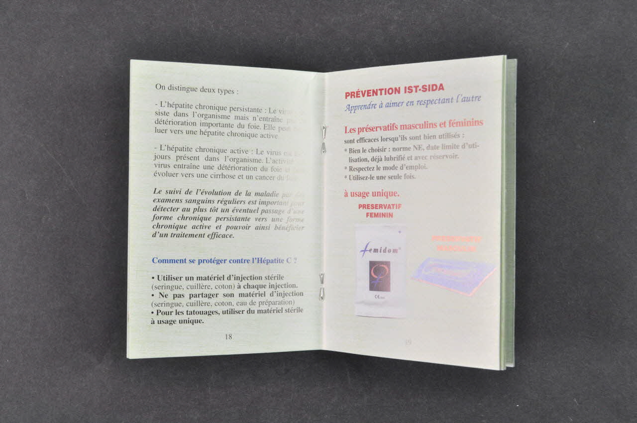 Sommaire // - p.1 (fond bleu) Présentation du Centre Inter Culturel Franco Maghrébin (CICFM) et de l'Association Franco Maghrébine (AFM) qui mènent l'opération de Prévention SIDA, IST, Toxicomanie et Hépatites sur le plan National. Coordonnées à Chalon-sur-Saône et Villeurbanne. // - p.2 Préface du Professeur Touraine, Lyon. appel à la solidarité. // - p.4 Le Sida : Qu'est-ce que le sida ? / Quels sont les modes de transmission ? / Quand faut-il consulter ? / Comment se fait le dépistage / Que veut dire être séropositif ? / Existe-t-il un traitement ? / Le virus du Sida ne se transmet pas dans l'ensemble des gestes de la vie quotidienne / Ceci ne transmet pas le virus du sida (avec petits dessins : WC, piscine, hammam, gymnase, dentiste, docteur, lieux publics, don du sang, école, café, restaurant, seringue à usage unique, rapport protégé, piqûres d'insectes, animaux domestiques, la salive, amitié et travail) / Attention ! Ceci transmet le virus du sida. Pratiques à haut risque (avec petits dessins : Pénétration vaginale non protégée, pénétration anale non protégée homme homme et homme femme, gode non protégé, partage de seringues). Pratiques à risque faible (avec petits dessins : fellation, cunnilingus) // - p12 En pleine page : "connectez-vous en toute sécurité : dessin de préservatif rose et de son enveloppe verte intitulée "kit de connexion" (gratuit, à retirer auprès des associations de lutte contre le sida) // - p.13-19 Les IST : Ce que c'est / Elles sont dues à.../ Les signes qui doivent alerter / Mesures à prendre / Il est important de consulter / Comment se protéger / Exemples d'IST : les hépatites / Prévention IST-Sida : Apprendre à aimer en respectant l'autre. Les préservatifs masculins et féminins // - p.20-21 En résumé : Vous êtes atteint par le VIH / Vous n'êtes pas atteint par le VIH / Les traitements // - p.22-24 En cas de prise de risque : // p.24 En gros caractères rouges, bleus, rouges, verts : "Dépistage VIH Sida. Que faire aujourd'hui ? / Vous avez pris un risque n'attendez plus 3 mois. / Réagissez vite. consultez... / mais avant tout n'oubliez pas de vous protégez et de protéger les autres." / Le traitement d'urgence dans les heures qui suivent le risque / De 15 à 30 jours après le risque / 3 mois après le risque. // - p.25 à 32 Adresses utiles : CIDAG / Autres téléphones utiles / Reproduction des affiches : Drogue Info service et Sida Info Service et des couvertures des CD et cassettes : Prévention sida arabe maghrébin / hépatites virales arabe maghrébin / Prévention sida en berbère // - p.33 à 36 explications en arabeTitre