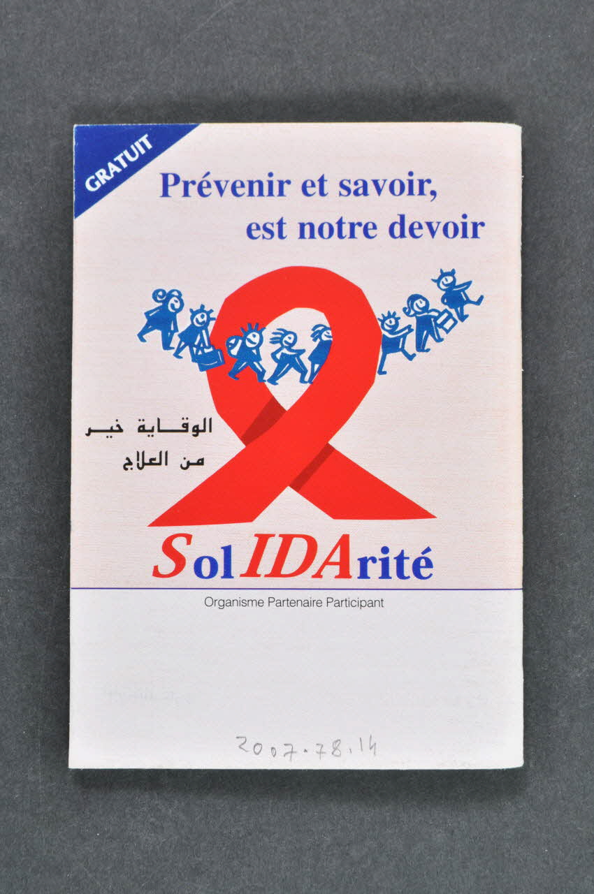 Solidarité (Sous le ruban rouge, en caractères bleus et rouges : (les lettres "SIDA en majuscules rouges, formant le mot "SIDA")), sur la couverturePrévenir et savoir, est notre devoir (En haut, au centre, en caractères bleus :), sur la couvertureDécor