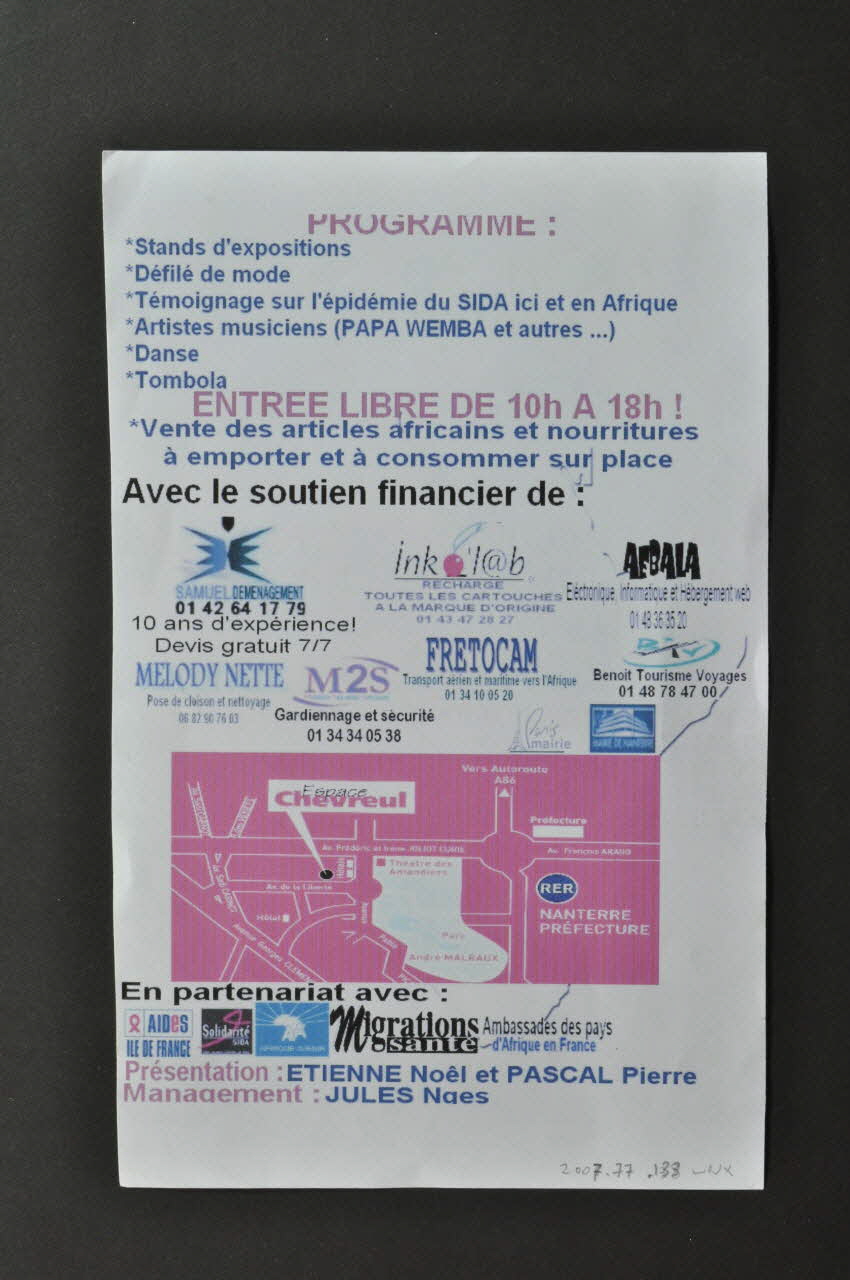 Programme : // Stands d'exposition // Défilé de mode // Témoignage sur l'épidémie du Sida ici et en Afrique // Artistes musiciens (Papa Wemba et autres...) // Danse // Tombola // Entrée libre de 10 h à 18 h ! // Vente des articles africains et nourritures // à emporter et à consommer sur place (Programme de la soirée situé en partie supérieure.), versoDécor