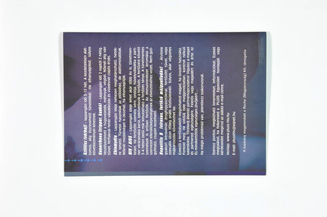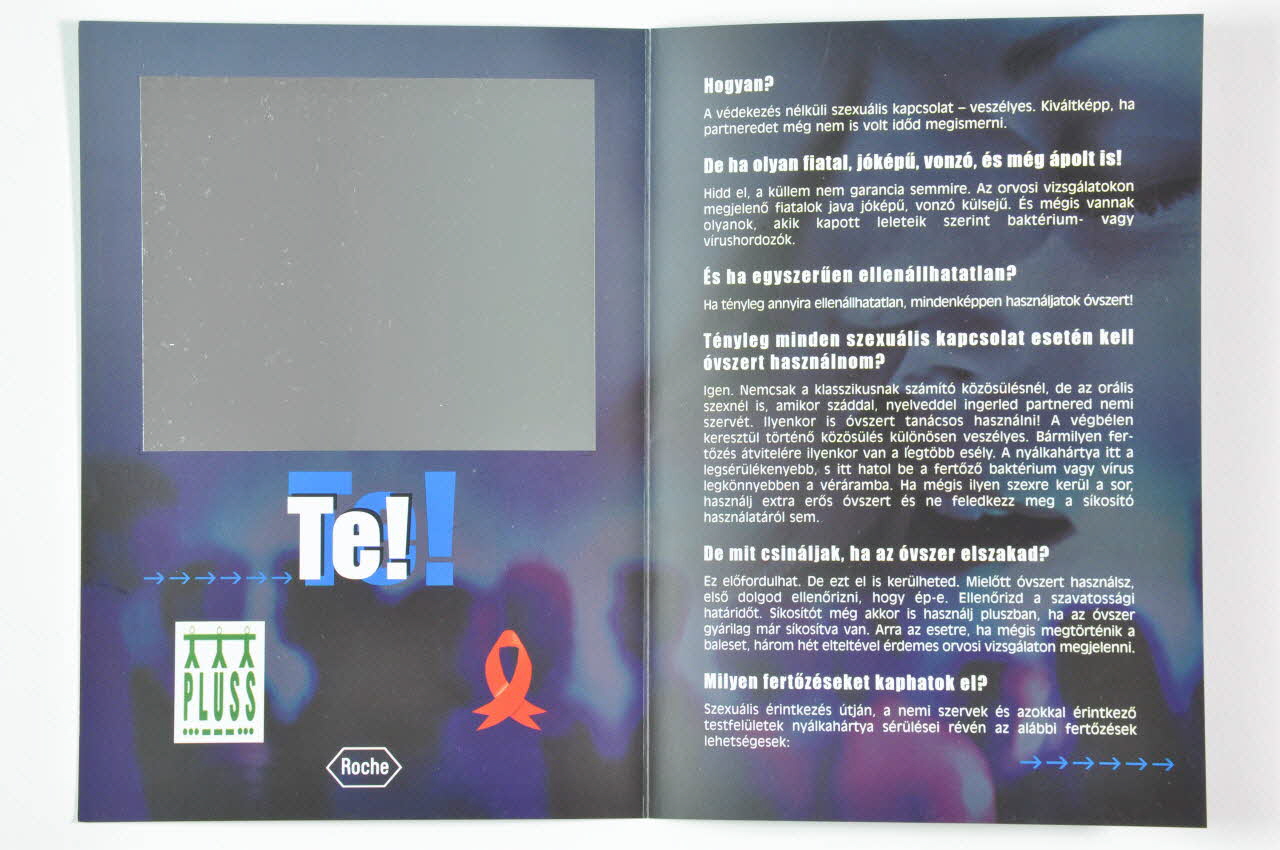 De forme rectangulaire, le dépliant en carton bleu est plié en deux. Il se lit verticalement. Sur la couverture, une photographie couleur représente une jeune femme en robe rouge parlant à l'oreille d'un jeune homme torse nu. En partie inférieure se trouvent des inscriptions blanches ombrées de bleu. A l'intérieur, sur la page de gauche, est collée une feuille argentée jouant le rôle de miroir. En dessous sont imprimés des inscriptions blanches ombrées de bleu et des logos. Le reste du dépliant présente des inscriptions blanches.Inscriptions