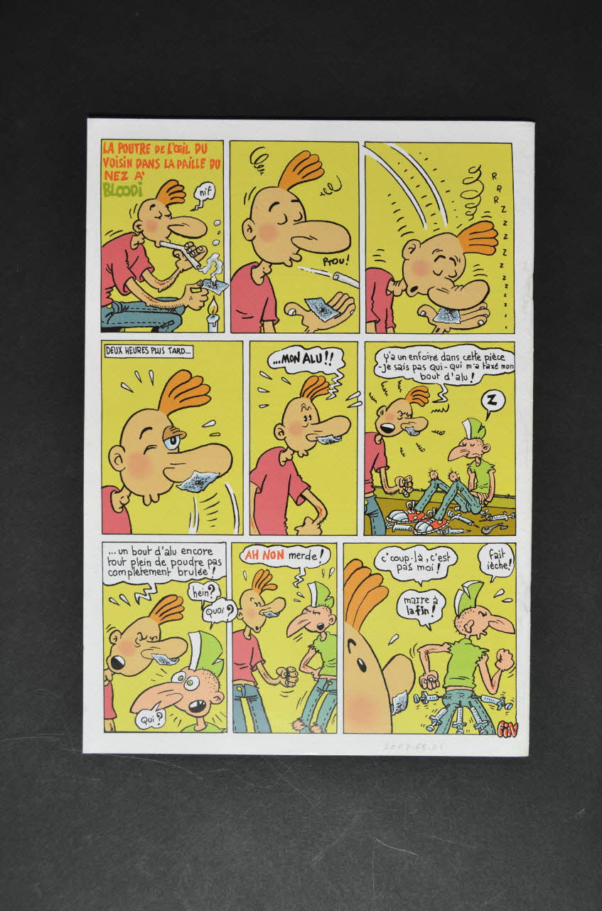 - salle d'injection, humour, histoire, parole de l'usager, usage de drogue, Coppel Anne, adolescence, plante, substitution, réduction des risques, Suisse, droits de l'usager de drogues, BD, anniversaire, métadone, législation, seringue, MILDT