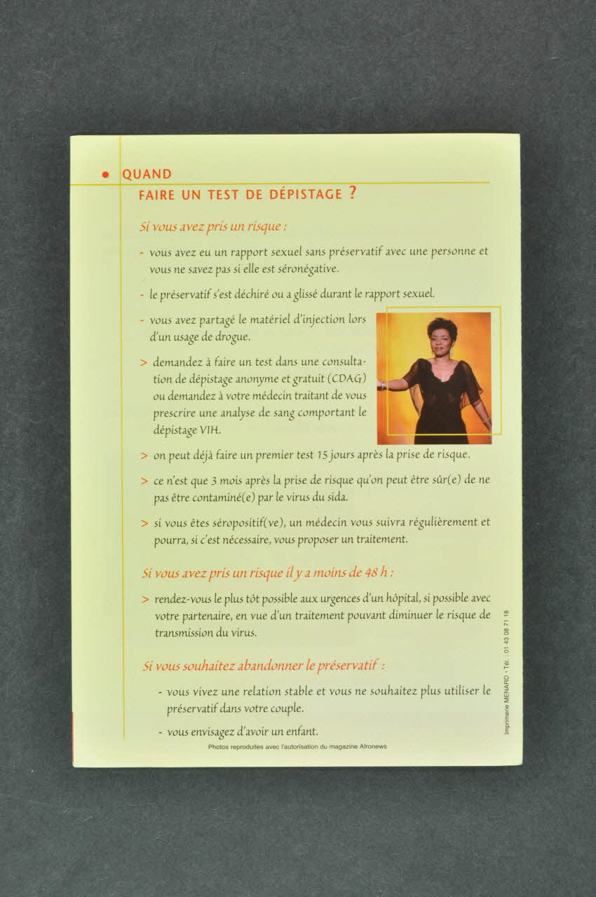 C'est quoi un // test de dépistage ? // // Pourquoi // faire un test de dépistage ? // Le résultat du test n'est valable que pour soi-même. Chaque partenaire doit faire son propre test. // // Où // faire un test de dépistage ? // Séronégatif(ve) = non porteur du virus du sida // Séropositif (ve) = porteur du virus du sida // // Quand // faire un test de dépistage ? // Si vous avez pris un risque // Si vous avez pris un risque il y a moins de 48 heures // Si vous souhaitez abandonner le préservatif. (et au verso), à l'intérieurLogo