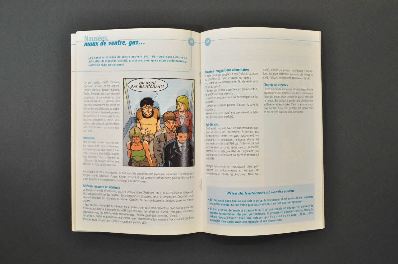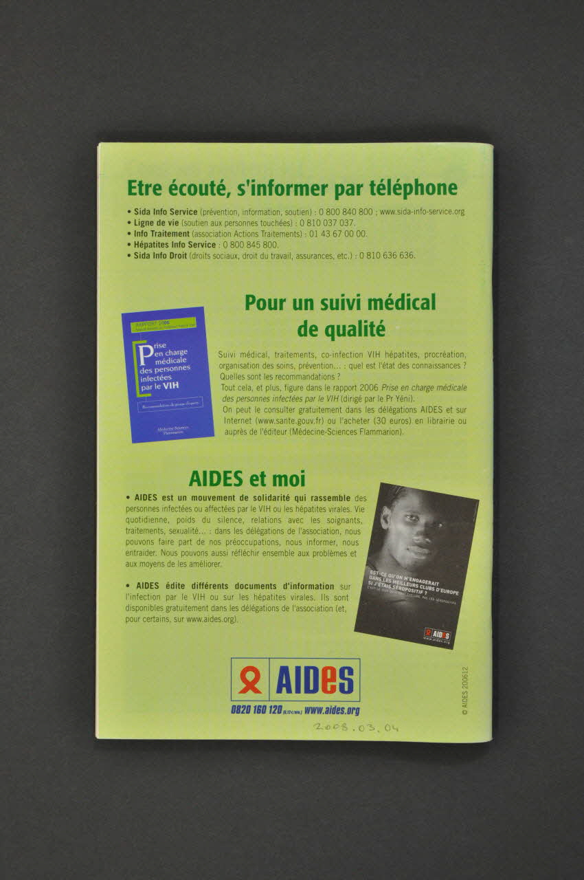 Sommaire // Les bases pour comprendre // p.04- Que se passe-t-il après la contamination ? // p.06- Quand et comment commencer le traitement ? // p.08- Dessine-moi une trithérapie // p.09- Charge virale, résistance, dosage // p.10- Bien prendre son traitement, c'est essentiel // p.12- Le traitement, est-ce pour la vie ou peut-on l'interrompre ? // p.13- Préparer ses consultations // p.14- Suivi médical et bilans sanguins : à quoi ça sert ? // p.16- Quand modifier le traitement ? // p.18- Participer à un essai // p.19- Que faire quand les traitements ne marchent plus ? // p.20- Médecines complémentaires et VIH // p.33- Les interactions, qu'est-ce que c'est ? // Hépatites et VIH // p.22- VIH+hépatites : vivre avec plusieurs maladies // p.24- Traiter l'hépatite et le VIH // Mieux vivre au quotidien // p.26- Bien dans mon corps ? // p.28- Bien dans mon assiette ? // p.29- Je dirs mal // p.30- Je suis fatigué(e) // p.32- Pour mes "bobo", je fais quoi ? // p.34- Vacances, voyages... // Moi, mes proches, mes amours... // p.36- Parle-moi de tes combats // p.38- Sexe et + : le désir et ses troubles // p.40- Sexe et + : parlons prévention // p.42- Désir d'enfant, grossesse et traitement // p.44- A Aides, on s'entraide // Face aux effets indésirables // p.45- Effets indésirables : les connaître pour mieux les gérer // p.48- Nausées, maux de vetre, gaz... // p.50- Les diarrhées // p.51- Toxicité mitochondriale : un gros mot pour un sérieux problème // p.53- Les lipodystrophies, qu'est-ce que c'est ? // p.54- Lipodystrophies : quelles interventions ? // p.56- Les neuropathies (fourmillements, brûlure, douleur...) // p.58- Les problèmes osseux // Les médicaments anti-VIH // p.59- Vaccins et traitements de l'immunité // p.60- Comment agissent les médicaments anti-VIH ? // p.62- Médicaments : quelle disponibilité (AMM, ATU)? // p.62- Médicaments : pour en savoir plus // Accès aux soins et aux traitements // p.91- 100% Sécu et protocole de soin // p.92- Etranger et séropositif : la loi française donne des droits ! // p.94- Combien coûtent les traitements anti-VIH en France ? // p.95 - Pays du Sud : comment s'informer sur les médicaments? // Les fiches médicaments (Le sommaire est indiqué en caractères bleus à la page deux.), à l'intérieurNom