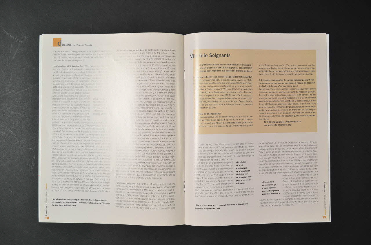- p.2 (verso de la couverture) Fond gris vert, impression en vert sur rectangles blancs : "Agenda 2005" et bulletin d'abonnement. - p.3 2 colonnes. A gauche, fond blanc, impression en noir et brun : sommaire. A droite, fond vert clair : éditorial sur la politique étrangère des Etats Unis en matière de lutte contre le sida (politique ABC))Rubrique : "Echos" par Françoise Vlaemÿnck - p.4 "Un commerce pas très éthique..." : En vente sur Internet et déjà commercialisés dans certains pays européens, des kits d'autodépistage de l'infection à VIH pourraient apparaître en France. Saisi par la Direction Générale de la santé en janvier 2004 sur l'opportunité d'autoriser une telle offre, le Comité consultatif national d'éthique pour les sciences de la vie et de la santé (CCNE) a rendu son avis en mars dernier : le "dépistage à domicile" pose davantage de problèmes qu'il en résout. Et conforte ainsi la position du Conseil national du sida (CNS) qui s'était emparé de cette question dès 1998." - p.5 "Plus d'inconvénients que d'avantages" : "Directeur des programmes internationaux de Aides, Emmanuel Trénado a été auditionné par le CCNE sur les problèmes éthiues que pourrait poser la commercialisation d'autotests de dépistage de l'infection à VIH. Entretien. Rubrique : "Echos" par Sandra Mignot - p.6 "La France épinglée par le Comité européen des droits sociaux" : "Suite à la mobilisation d'ONG et d'associations de défense des droits de l'homme, les réformes concernant l'aide médicale d'Etat (AME) et la couverture maladie universelle (CMU) sont pointées du doigt par le Conseil de l'Europe" Rubrique : "Echos" par Marie de Cenival - p.7 "Génériques : après l'Inde, le Brésil jettera-t-il l'éponge ?" : "Malgré la mobilisation de nombreuses associations de lutte contre le sida, dont Sidaction, qui craignaient que ce projet n'entrave pour toujours la production et l'exportation de produits génériques, l'Inde a finalement adopté en avril une loi octroyant un brevet sur les produits pharmaceutiques. Un texte assoupli et amendé par rapport au projet initial, mais qui, conjugué à l'actuelle position du guvernement brésilien sur les génériques, laisse présager le pire quant à l'avenir des malades des pays pauvres." Rubrique Innovation par Marianne Bernède - p.8 "Turiho : un centre à la "pointe" : A Bujumbura, capitale du Burundi, les locaux de Turiho ont été inaugurés le 4 mars dernier. Premier centre burundais de prise en charge globale des personnes atteintes par le VIH, il a été créé et est géré par l'Association nationale des séropositifs et sidéens (ANSS). Coordinatrice des activités de cette association depuis 5 ans et médecin permanent à Turinho, Marie-Josée Mbuzenakamwe nous démontre en quoi ce lieu innovant peut être un outil de progrès dans la lutte contre le sida en Afrique." Rubrique Repères par Tiphaine Pierret - p.10 "Un système affecté." : "Composé du cerveau et de la moelle épinière, le système nerveux central n'est pas à l'abri de l'infection par le VIH. Chez certaines personnes séropositives, le virus peut provoquer, directement ou non, des troubles neurologiques parfois graves, voire irréversibles et, dans certains cas, mortels. Le Dr Jacques Gasnault, neurologue et responsable du service de soins de suite et de réadaptation au CHU de Bicêtre (Kremlin-Bicêtre) dresse un bilan de ces pathologies" - p.12 "VIH et cerveau : 20 années de recherche" : "L'impact du VIH sur le cerveau a fait l'objet de nombreuses recherches. Les premières études ont permis de déterminer les cibles cérébrales du virus et d'émettre des hypothèses sur les mécanismes cellulaires responsables des maladies neurologiques. Mais depuis l'arrivée des multithérapies en 1996, la dynamique de la recherche neurologique sur le VIH s'est considérablement relâchée. Explications avec le Pr Marc Tardieu, directeur de recherche du laboratoire "immunité antivirale systémique et cérébrale au CHU de Bicêtre (Kremlin-Bicêtre) Rubrique Entretien par Florence Raynal - p.14"Le barebacking, une sexualité 'entre soi'" : "Psychologue de l'espace à l'unité mixte de recherche en géographie sociale "Espaces et sociétés" du CNRS-laboratoire Carta, Alain Léobon coordonne le volet français d'un programme portant sur les usages d'Internet et la recomposition de la rencontre homosexuelle au risque du VIH-sida. En matière de barebacking, il constate que la contamination n'est pas le moteur de cette culture de sexe. En outre, les barebackers ne sont pas dans une absence totale de protection." Rubrique Dossier par Veronica Noseda (fond beige) - p. 16 "Malades et soignants : un cheminement commun ?" : "La relation soignant-soigné met face à face deux personnes fondamentalement égales mais dont l'approche de la maladie diffère : si la compétence du soignant est tout d'abord d'ordre technique, le soigné pense savoir mieux que personne ce qui est bien pour lui. Comment mettre au diapason les aspirations et les intérêts parfois divergents de ces deux acteurs qui ont pourtant un même objectif final : l'amélioration de l'état de santé du malade ? Une question qui se pose de façon aiguë avec le VIH. Analyse d'une relation marquée par le devenir de l'épidémie et des malades." - p.19 Encadré : "VIH Info Soignants - p.21 "S'affirmer en complément du médecin" : "Eric, 43 ans, est infecté depuis plus de 15 ans. Ayant vécu dans le Sud de la France et en Belgique, il témoigne des disparités de traitement subies au sein d'un service spécialisé dans un grand hôpital urbain et en milieu rural." Rubrique Itinéraire par Marianne Bernède - p. 22 "Ambassadeur sans frontières" : "Il existe en France quatre abassadeurs sans ambassade dont la mission est dévolue à une cause : l'environnement, les droits de l'homme, le développement durable et le sida et les maladies transmissibles. Cette dernière charge a été confiée, le 2 f