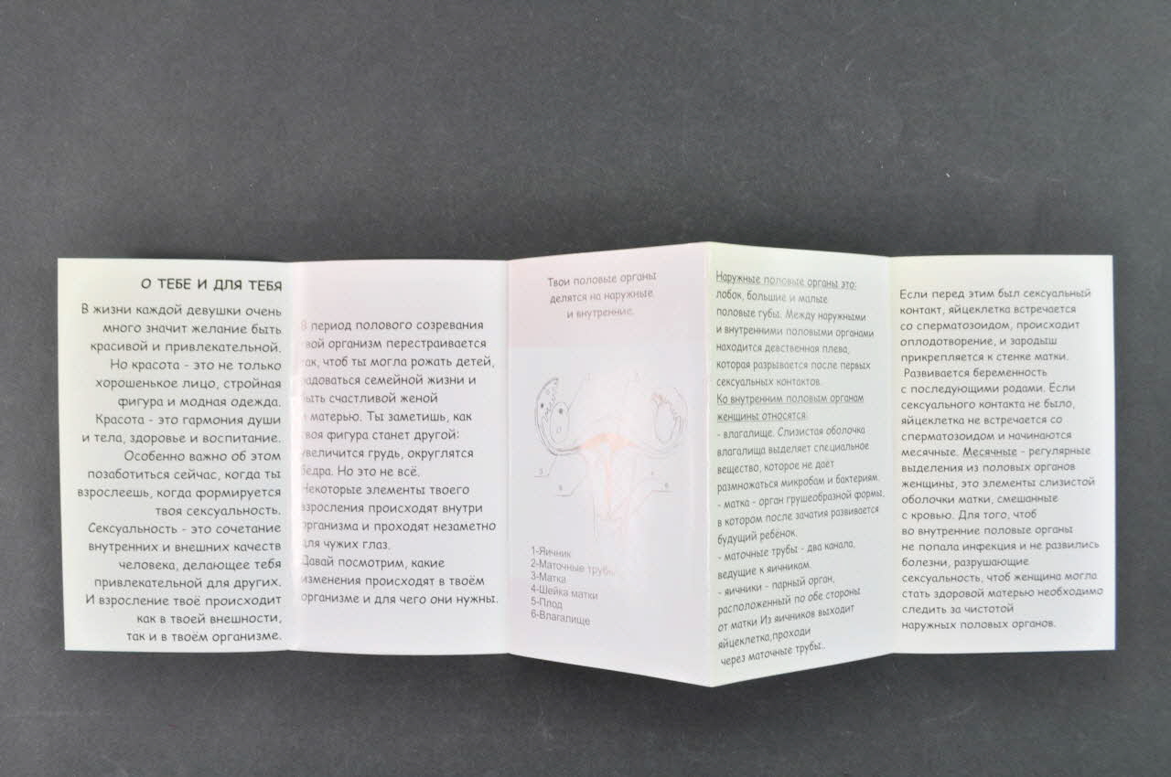 La couverture est composée autour de la photographie couleur d'un tableau représentant des femmes gitanes. Au dessus de leur tête se trouve une inscription en caractères jaunes. En bas à droite : Odessa 2004. Au dos on observe des femmes gitanes dansant. Au dessus de leur tête, une inscription en caractères jaunes. En bas est imprimé un logo et des coordonnées. L'intérieur présente un fond rose pâle couvert d'impressions en noir. On y voit le dessin anatomique du système sexuel féminin au feuillet 3.Décor