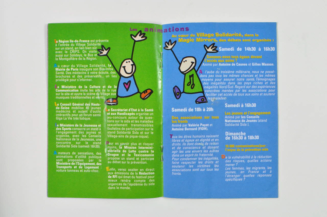 Festival / Solidays, au centreVillage" : Débat : "Sommes-nous tous égaux devant les soins"; "Les soeurs de la perpétuelle indulgence"; Débat : "des associations sur tous les fronts"; Débat :"16000 contaminations par jour : l'enjeu de la prévention sida » (p. 3-4), centreLes animations partenaires // L'album disque : "plus de 30 artistes solidaires contre le sida, solidaires pour l'Afrique". Plan du site // Les animations du village (p. 5-10), centre"Le village solidarité Là-Bas" (associations menant des actions de solidarité à l'étranger) : Action contre la faim, Aide et Action, Aide Médicale Internationale, Amnesty International, Artisans du Monde, Care France, FIDH/LDH, FNUAP, France Libertés, Frères des Hommes, Handicap International, Hôpital Sans Frontière, Institut des jeunes aveugles du Mali, Médecins Sans Frontières, Partage, Plan International France, Pour l'an 2000 : annulons la dette, Première Urgence, Solidarité Laïque, Un enfant par la main, UNICEF, Vétérinaires Sans Frontières , Volontaire du Progrès » (p. 15-16), centreLes animations du village solidarité : opération : "des capotes pour tous"; exposition de déclic-expo (jeunes artistes), de photos, tente du Patchwork des Noms, questions pour un(e )champion(ne) du safe sex, tente réduction des risques. (p. 18), centreDécor
