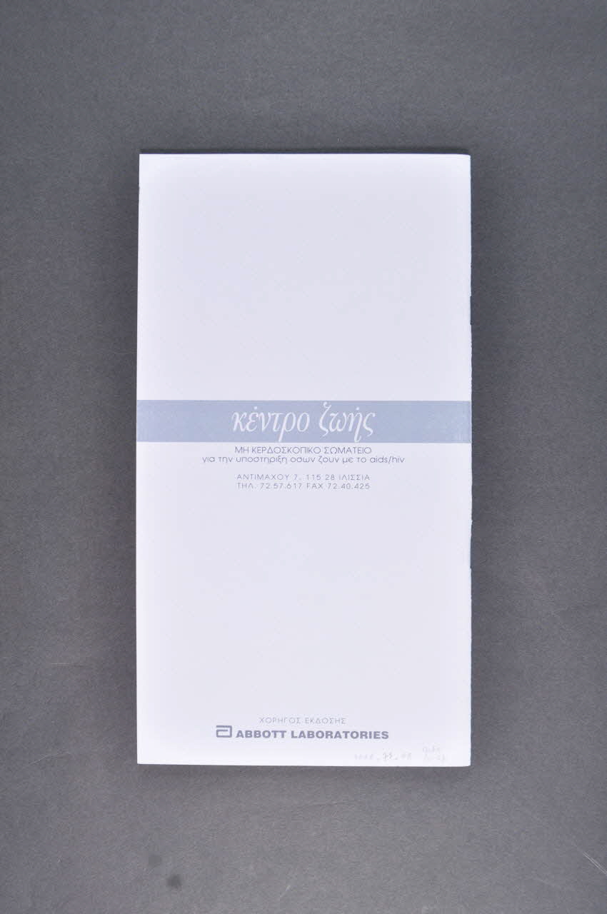 Au dos du livret on peut voir le nom de l'association et ses coordonnées en grec (au milieu). Dans la partie basse se trouve le nom d'un laboratoire partenaire (en grec et en anglais).