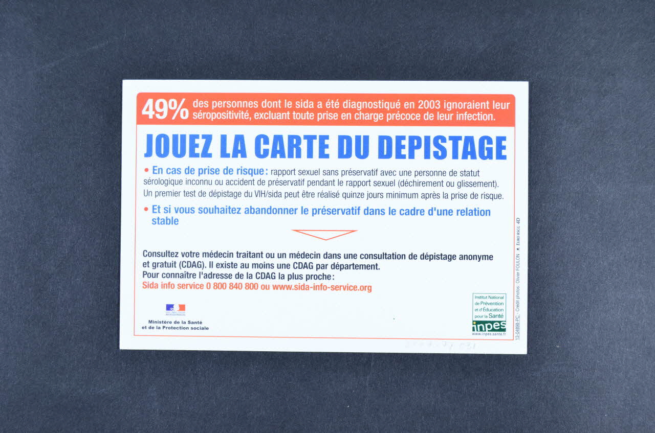 Sida info service 0 800 840 800 ou www.sida-info-service.org (En rouge, dernière ligne du texte), versoDécor