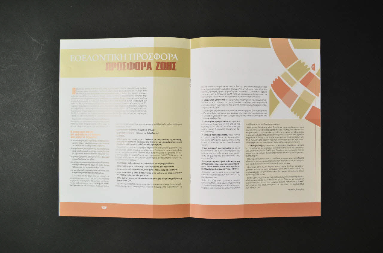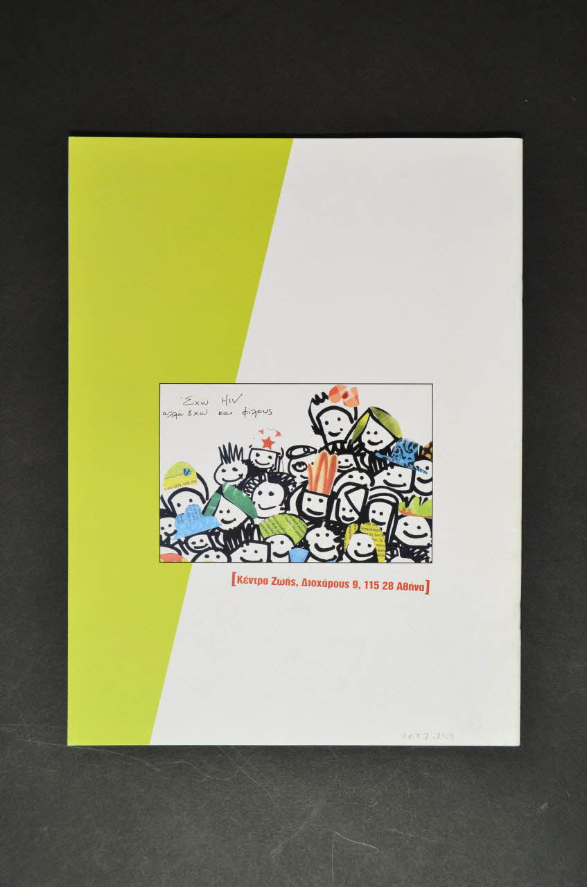 La couverture est sur fond blanc avec des bonhommes dessinés au feutre noir. Dans la partie supérieure en caractères grecs rouges et gris figure le titre de la revue.