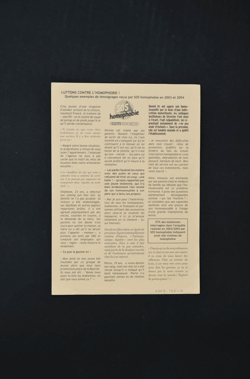 Au recto on peut lire le titre de ce tract puis il y a un texte sur trois colonnes (témoignages de situations homophobes) et le logo de l'association. Au verso on retrouve des témoignages sur une colonne et dans un encart il y a les coordonnées de l'association. Dans un autre encart il y a une explication de l'homophobie et de l'action de l'association.Inscriptions