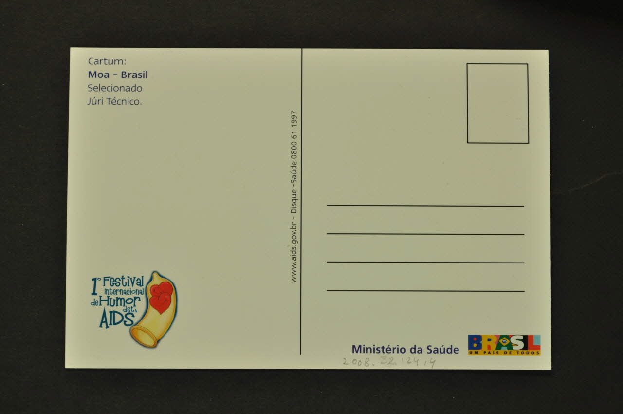 Ministério da Saúde BRASIL UM PAIS DE TODOS (en bas à droite), verso1° Festival // internacional // de Humor // dst & // AIDS (en bas à gauche, avec un dessin de deux coeurs dans un préservatif.), versoAdresse, date